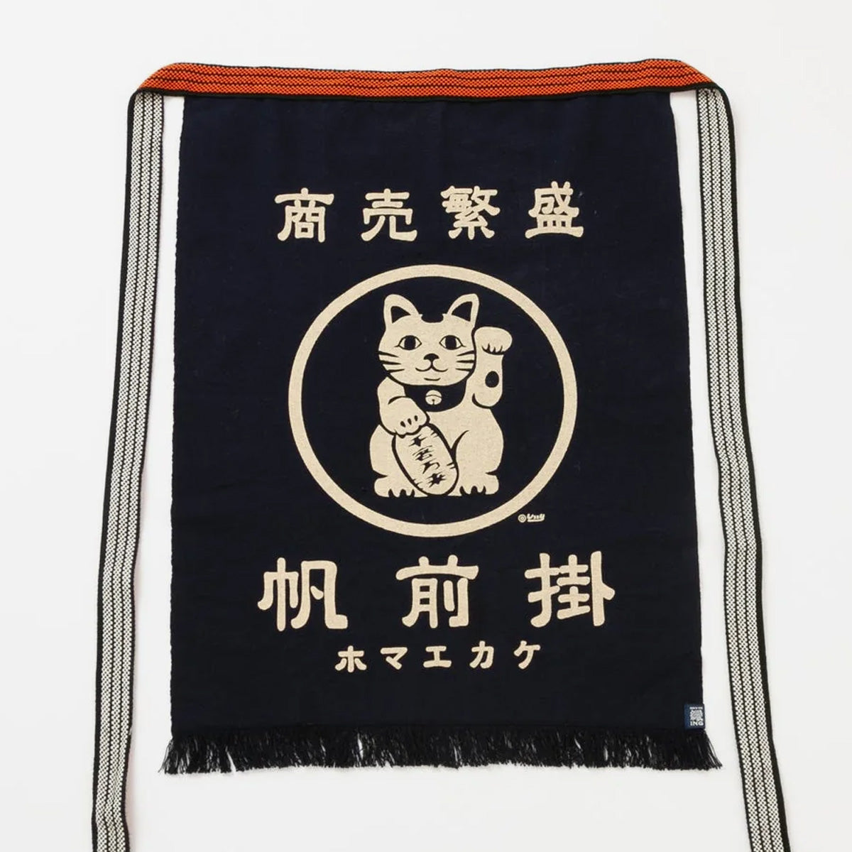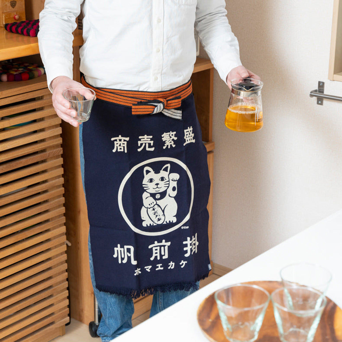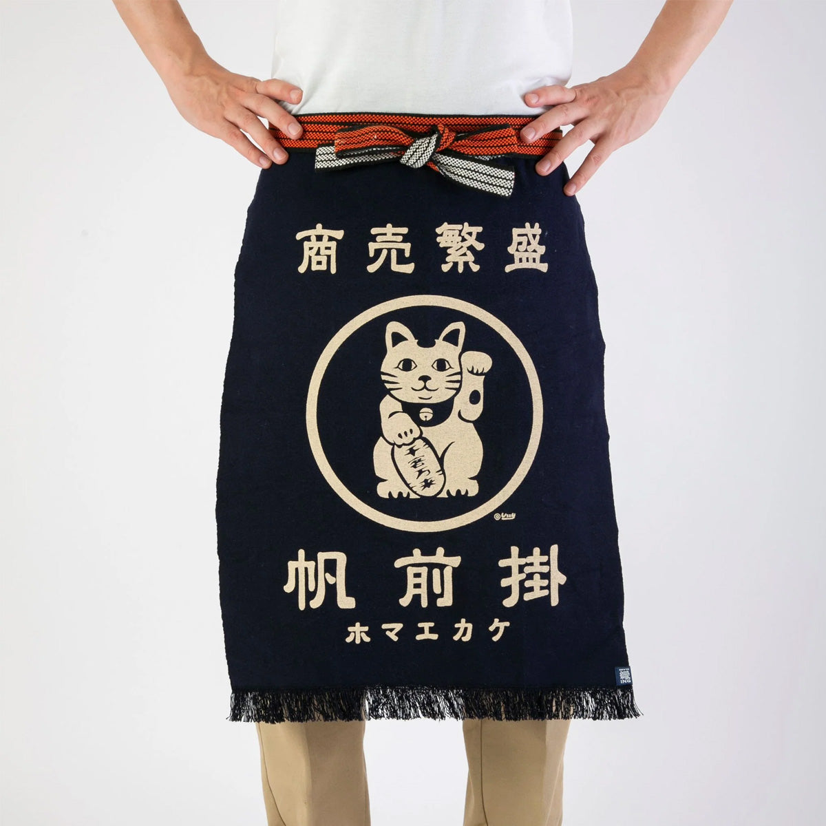 Diese Maekake trägt die maneki neko, die kleine winkende Katze, die in Japan offiziell als Glücksbringer gilt und überall dort steht, wo Hoffnung auf ein gutes Omen immer willkommen ist. Auf dem kräftigen Stoff wirkt sie charmant und ein wenig verspielt, als würde sie dir beim Kochen leise zublinzeln. Eine Schürze, die sofort gute Stimmung in die Küche bringt.