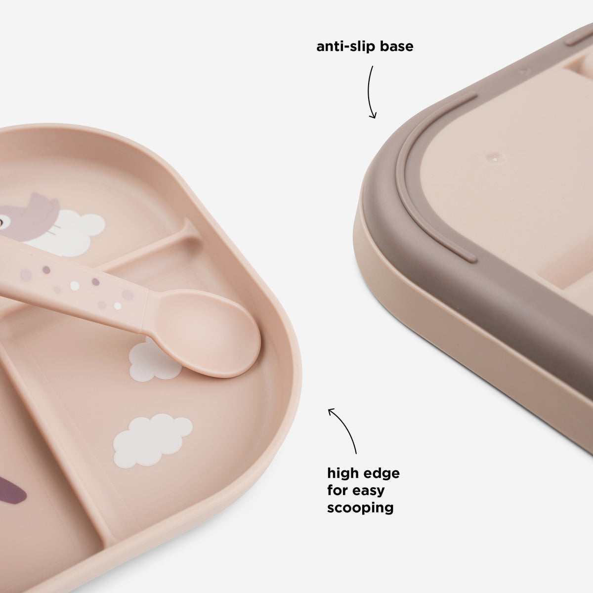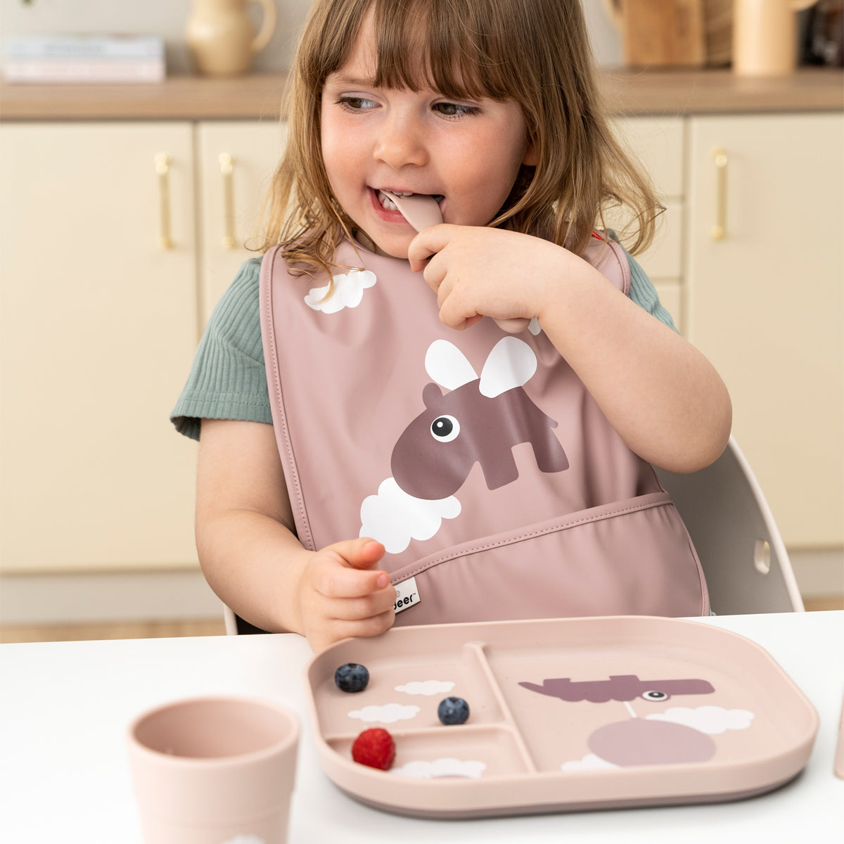 Das verspielte Happy Clouds-Motiv zeigt Croco und Birdee zwischen rosa Wolken – neugierig und bereit für neue Geschmackserlebnisse. Der dunklere Rosaton am Tellerboden bringt ein schönes, zweifarbiges Detail ins Spiel.