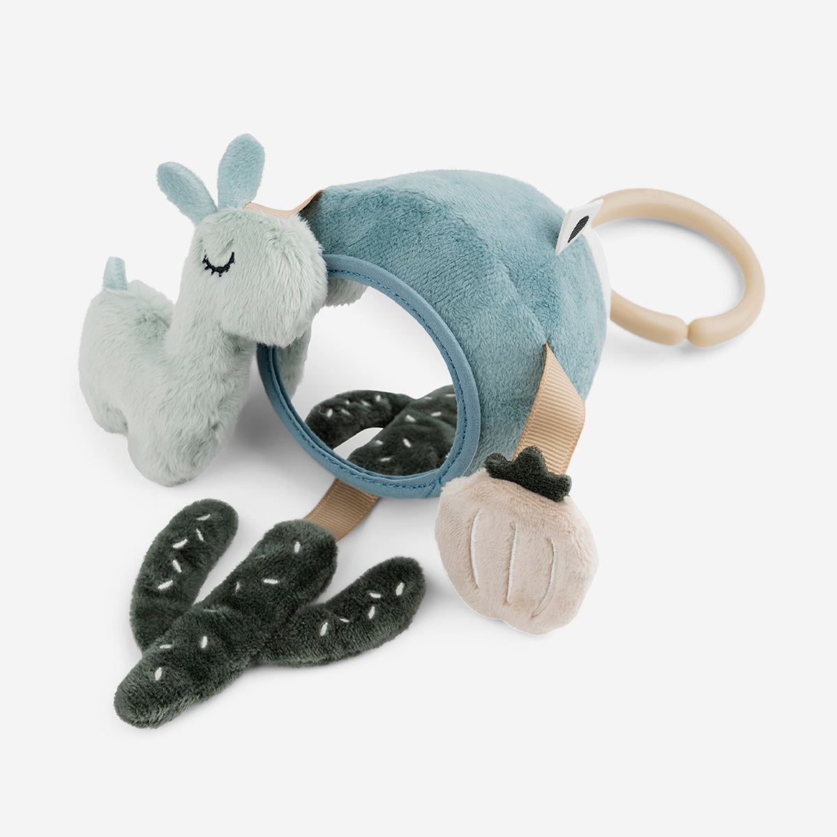 Die ruhigen Blautöne mit grünen Akzenten machen das Spielzeug optisch angenehm und sorgen gleichzeitig für sanfte visuelle Reize. Ein kleines Alltags-Must-have für neugierige Babys.