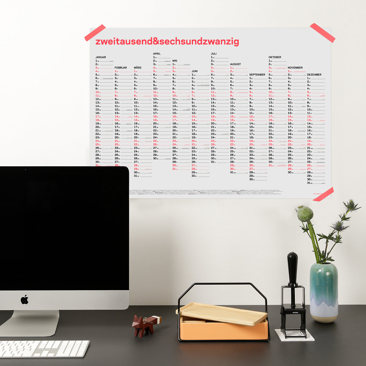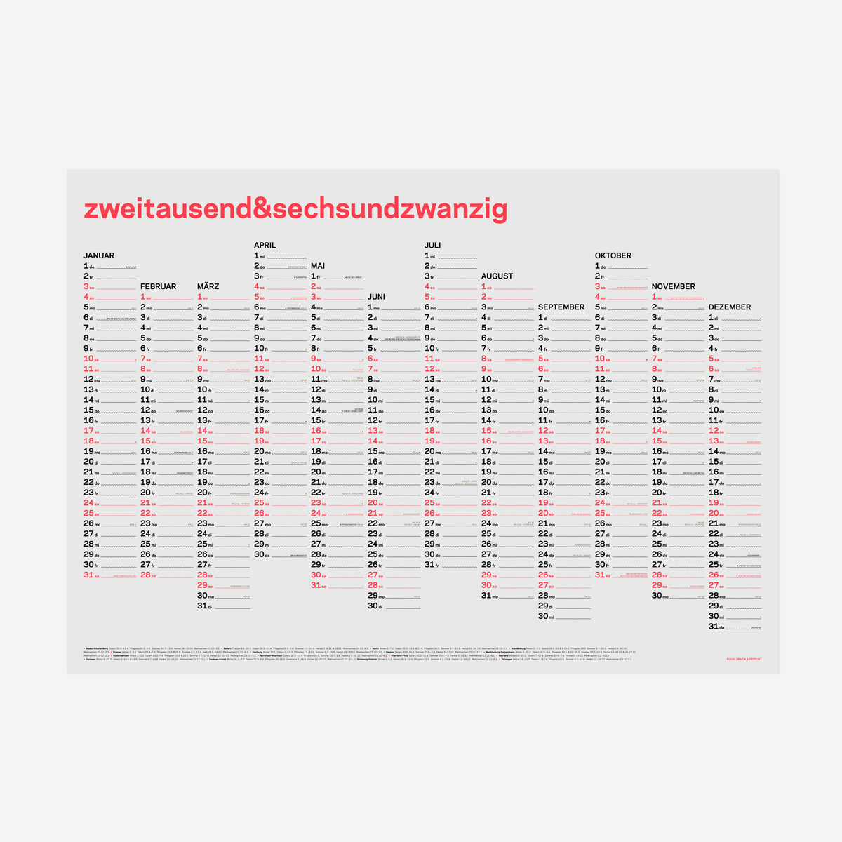 Der Kalender ist als dreifarbiger Siebdruck produziert: Ein Neon-Korall, wie es der Monitor gar nicht wiedergeben kann, für die Wochenenden. Schwarz als Grundfarbe für die Wochentage. Und als Akzentfarbe für die feinen Details pures Gold.