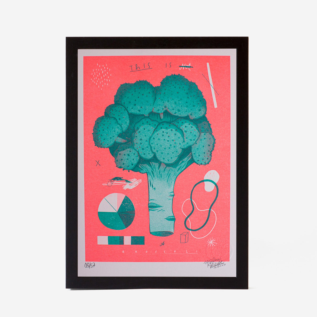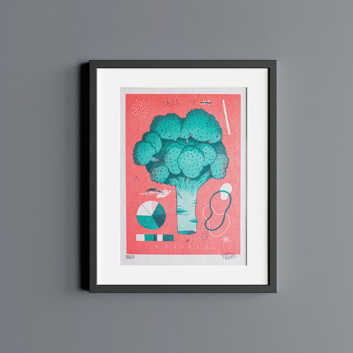 Der Brokkoli Artprint ist mit toller, fluoreszierender Farbe gedruckt (was auf dem Foto leider nie so toll aussieht wie in Wirklichkeit!). Der Druck ist einzeln signiert, nummeriert und geprägt.