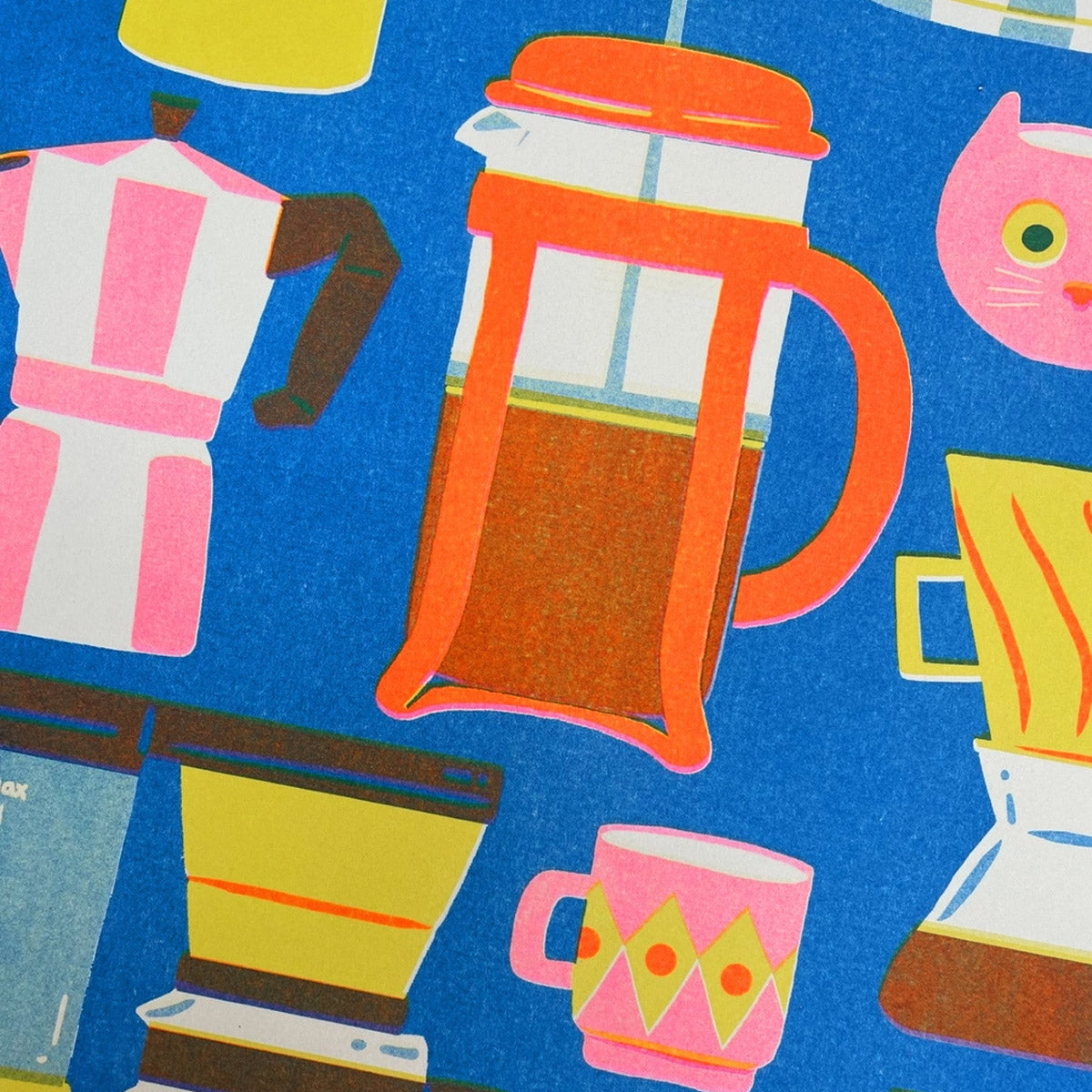 Filter, French Press oder Espressokanne – der „Coffee Pot“ Riso Print von Naomi Wilkinson feiert die schönsten Arten, Kaffee zuzubereiten. Knallige Farben treffen auf Alltagsglück in Posterform.