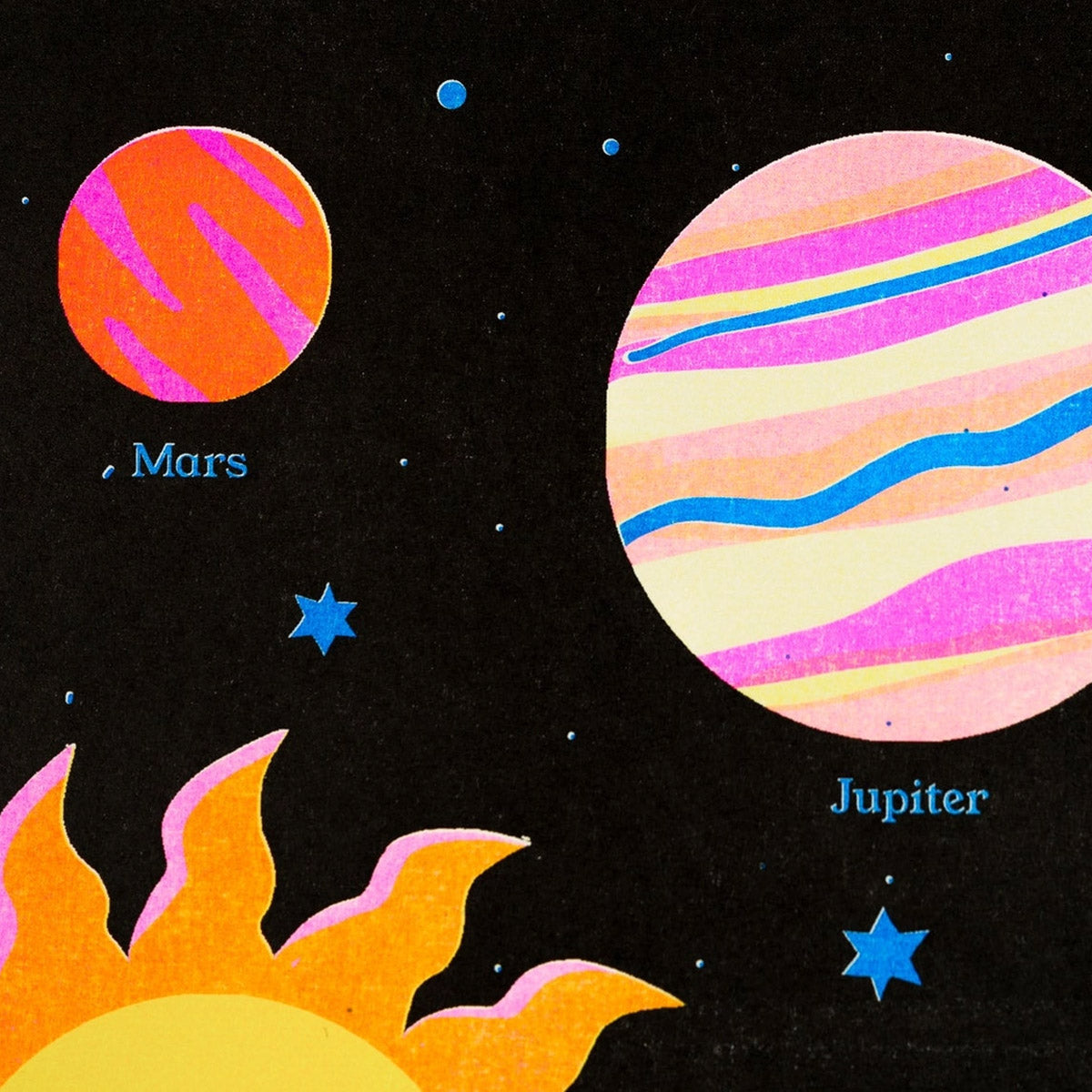 Einmal durchs All, bitte: Der „Solar System“ Riso Print von Naomi Wilkinson zeigt unser Sonnensystem als farbenfrohes Pop-Art-Universum. Planeten, Sterne und ein Hauch Retro-Science-Fiction – hier macht Astronomie einfach gute Laune.