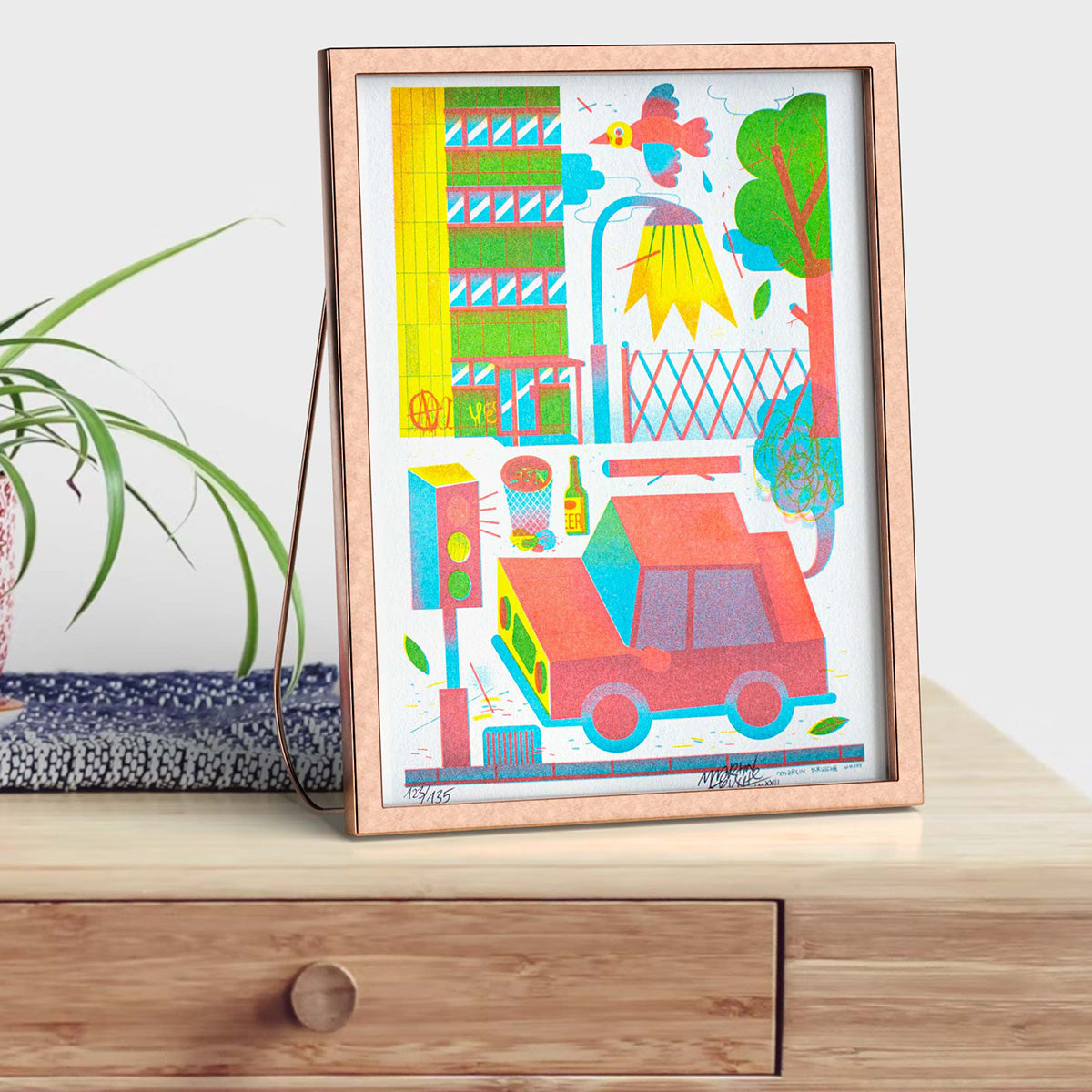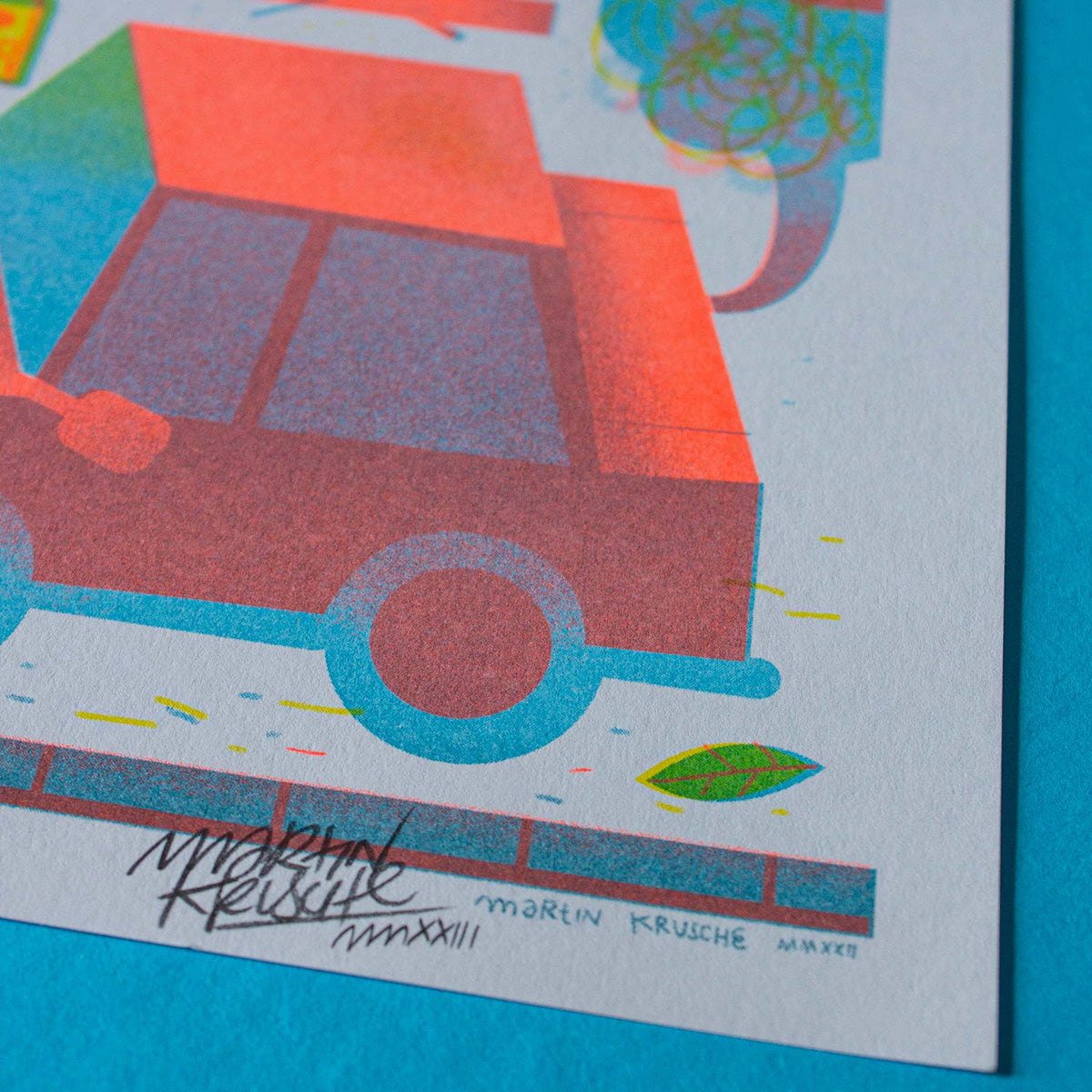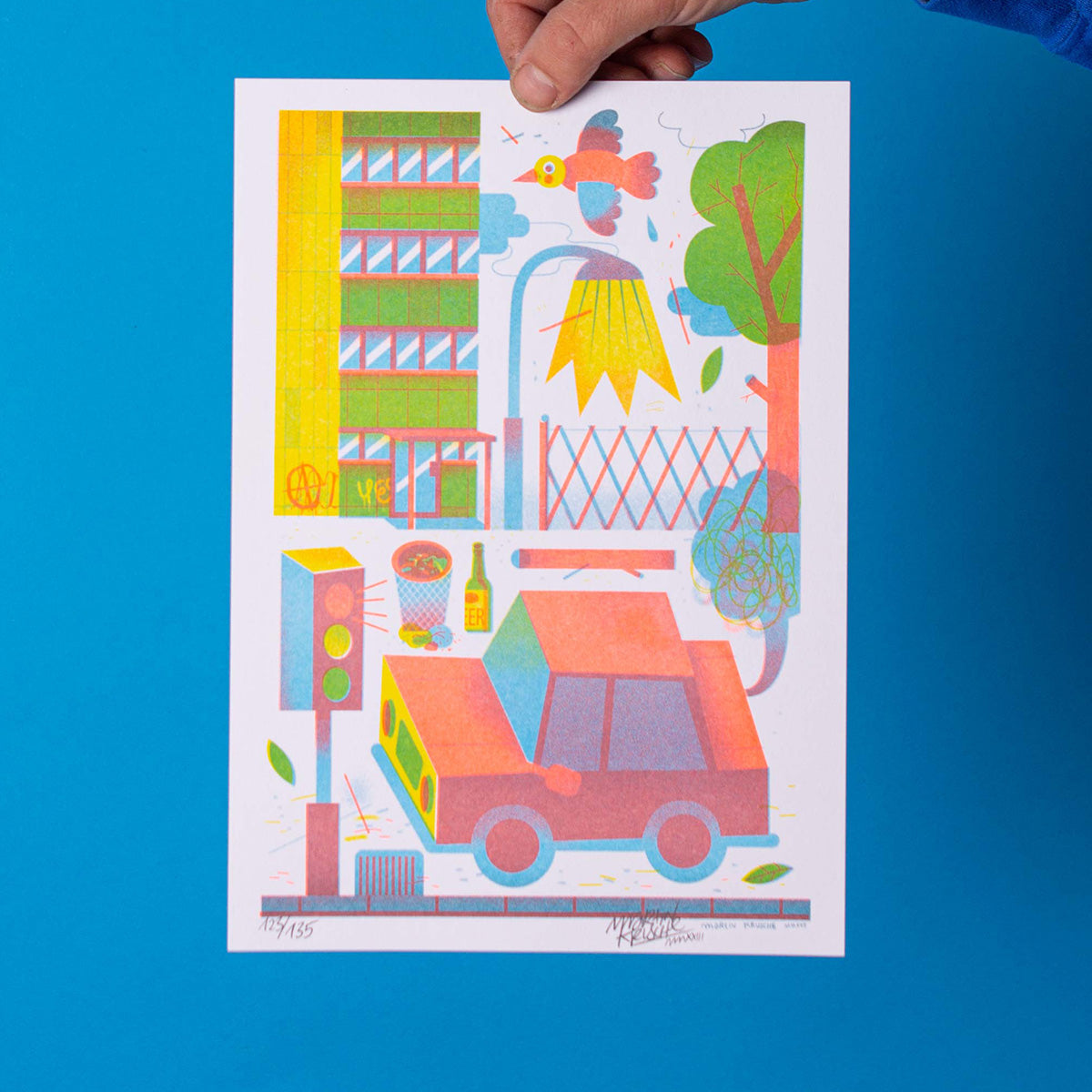Der Stadt Artprint ist ein dreifarbiger Risografie-Kunstdruck mit leuchtenden Farben. Jeder Druck ist einzeln signiert und nummeriert.