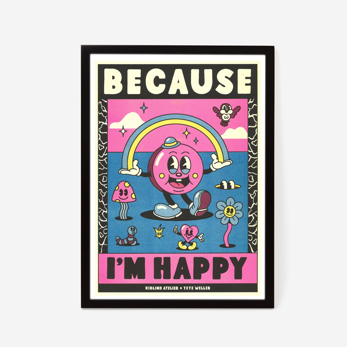 Hier wird klare Typografie mit charmant überdrehten Charakteren kombiniert – lächelnde Pilze, ein tanzendes Herz, ein grinsender Regenbogen. Gedruckt im Risografie-Verfahren vom Kiblind Atelier auf hochwertigem Papier. Für Wände, die ein bisschen mehr Spaß vertragen.