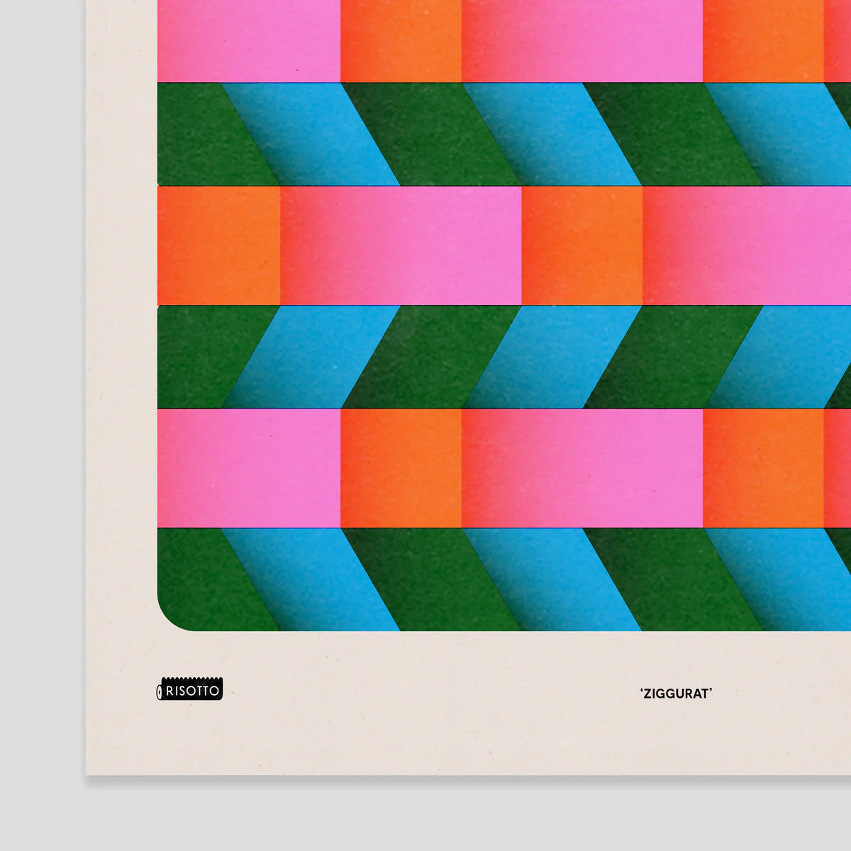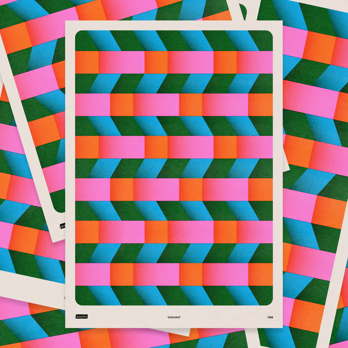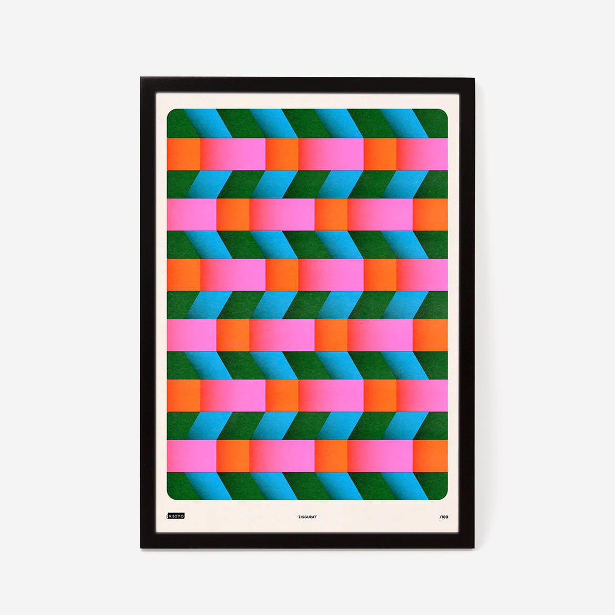 Der Druck aus der Repeats-Collection von Studio Risotto ist mit seinen vibrierenden, fluoreszierenden Farben ein leuchtender Hingucker an der Wand.