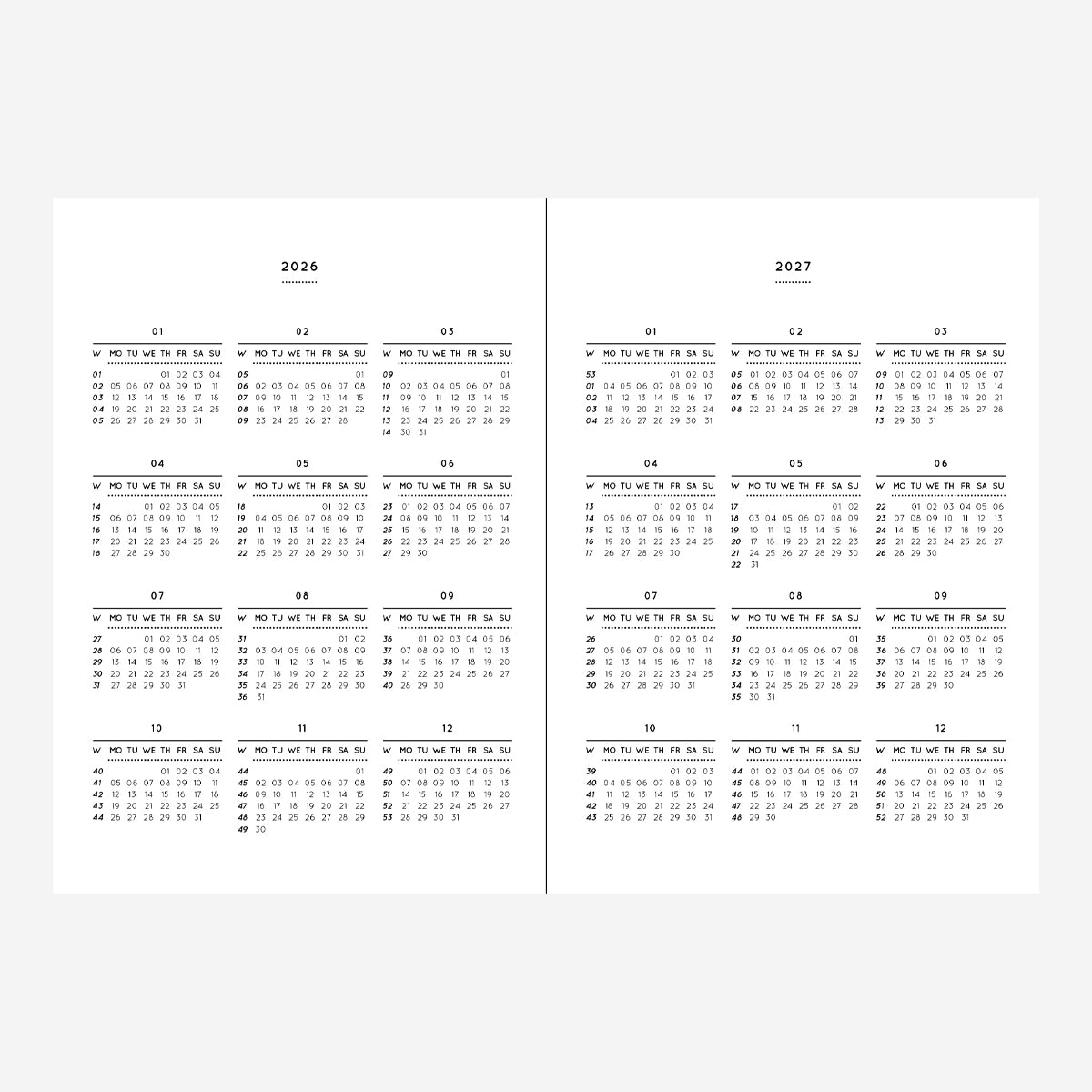 Es gibt einen Jahresüberblick für 2026 und 2027, eine Übersichtsseite pro Monat, Doppelseiten für jede Woche und ein weitere Seiten für Notizen.
