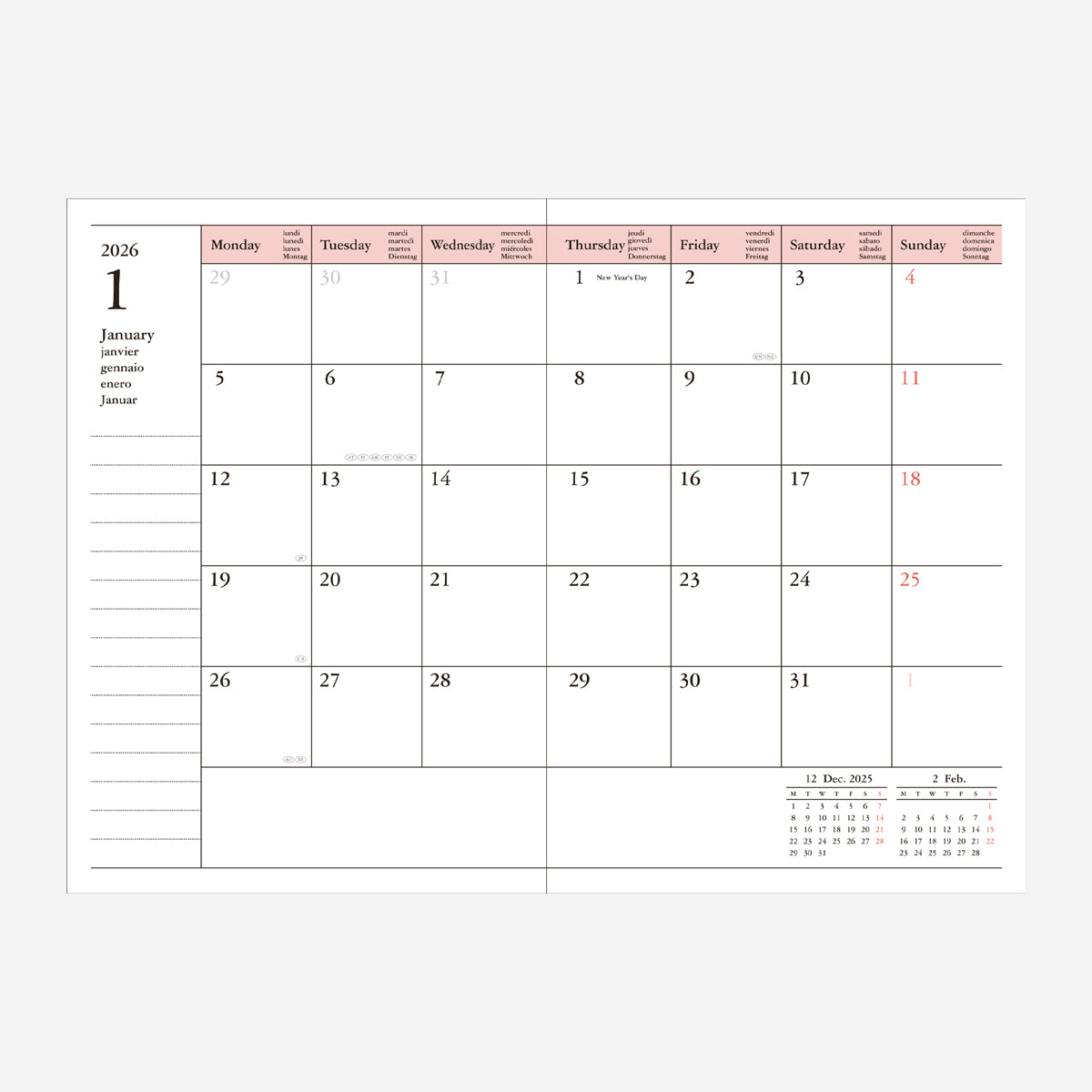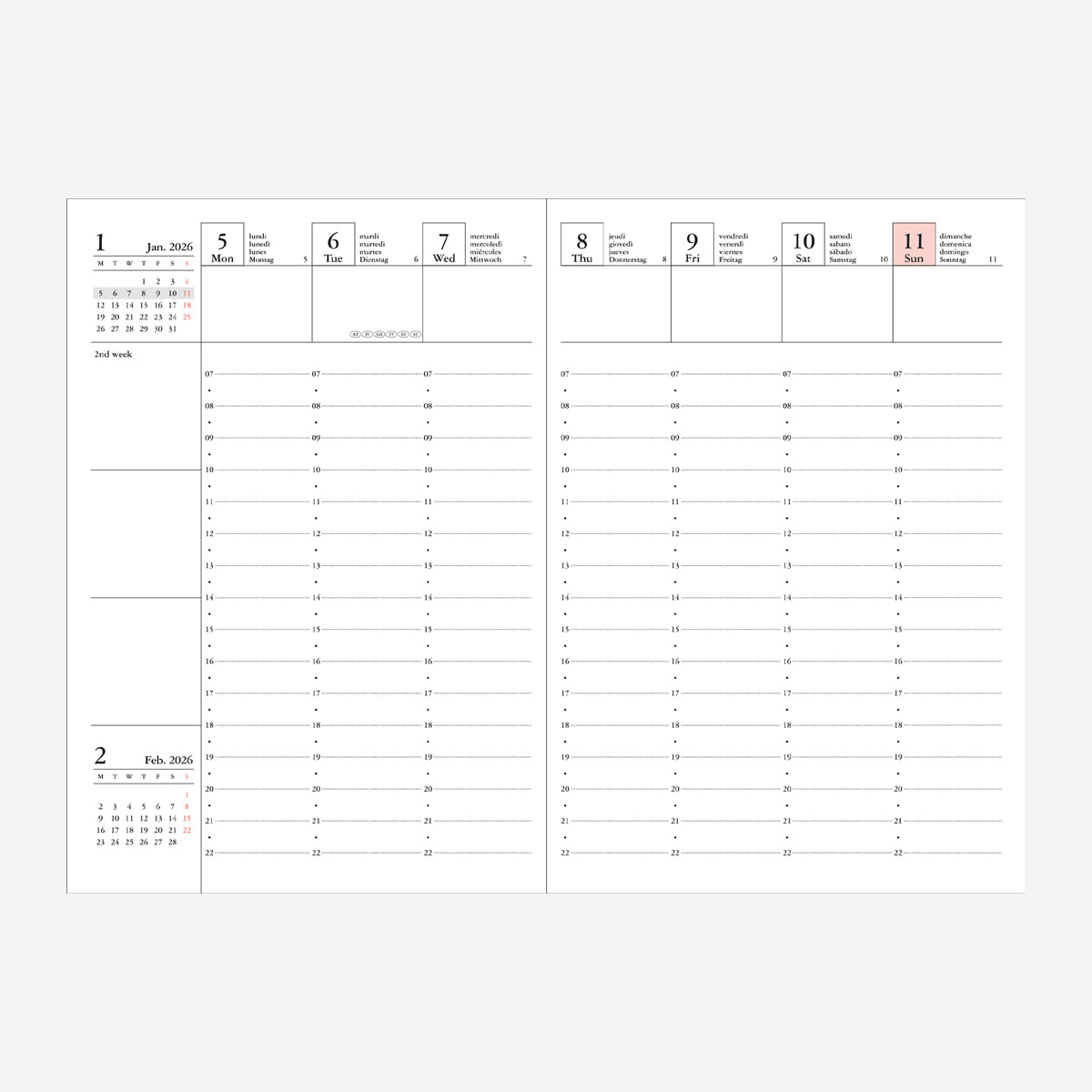Das Kalendarium zeigt eine Woche pro Doppelseite in vertikalen Spalten, die feine Uhrzeit-Markierungen haben. Auf der Doppelseite ist außerdem noch Platz für Notizen. Zwei Lesebändchen erleichtern zusätzlich die Orientierung. Dem Kalendarium sind außerdem Übersichtsseiten aller Monate 2026 vorangestellt.