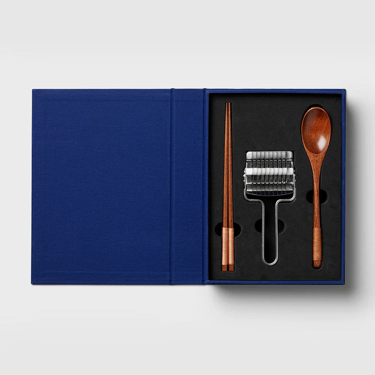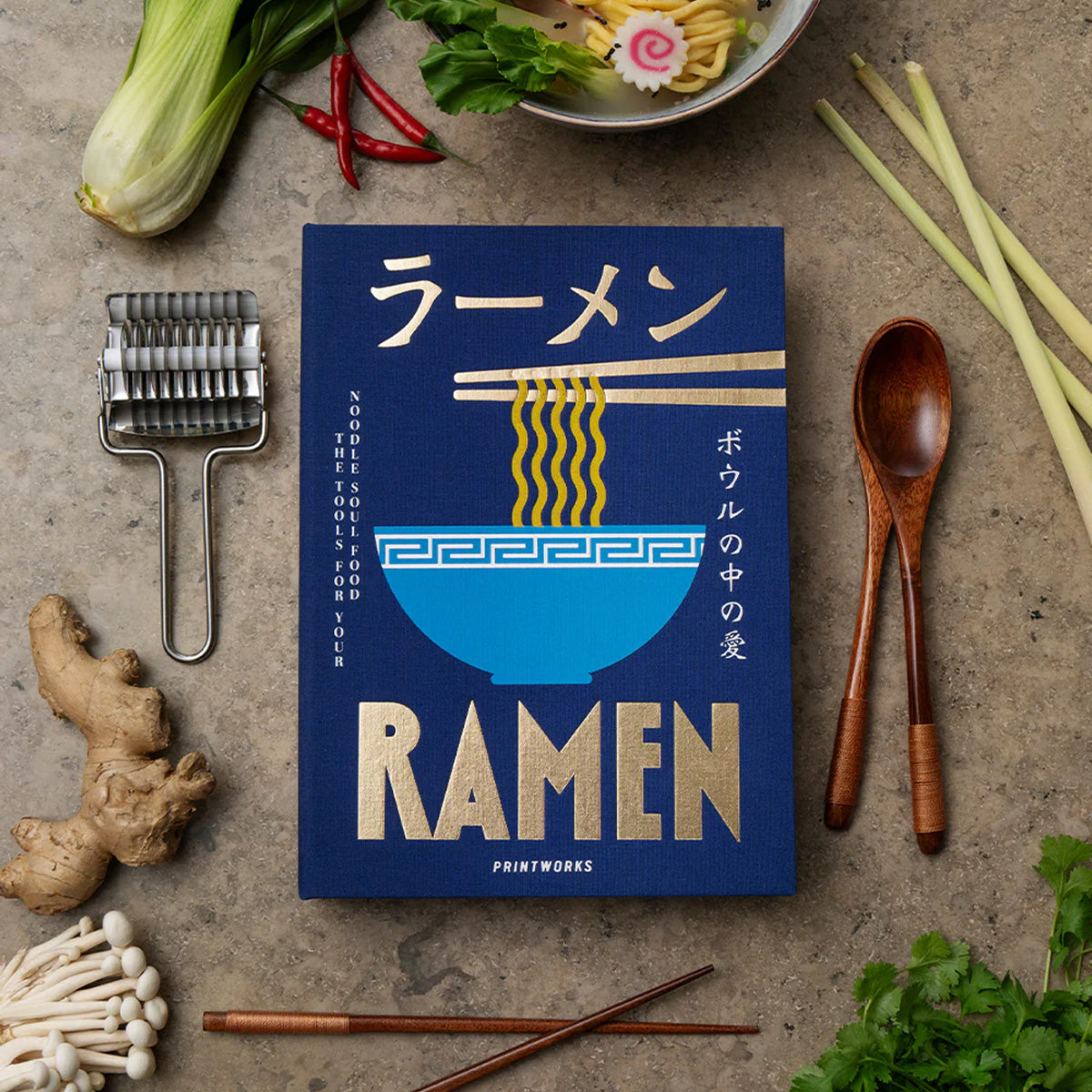 Das Ramen Tools Geschenkset von Printworks bringt japanisches Wohlgefühl in die eigene Küche. Verpackt in einer eleganten Box, die aussieht wie ein Kochbuch, steckt alles drin für einen perfekten Ramen-Abend: ein Nudelschneider für frische Pasta, zwei tiefe Löffel für Brühe und Toppings und zwei Paar Essstäbchen zum Teilen. Ideal als Geschenk oder für das eigene Kochritual – und schön genug, um danach im Regal zu bleiben.