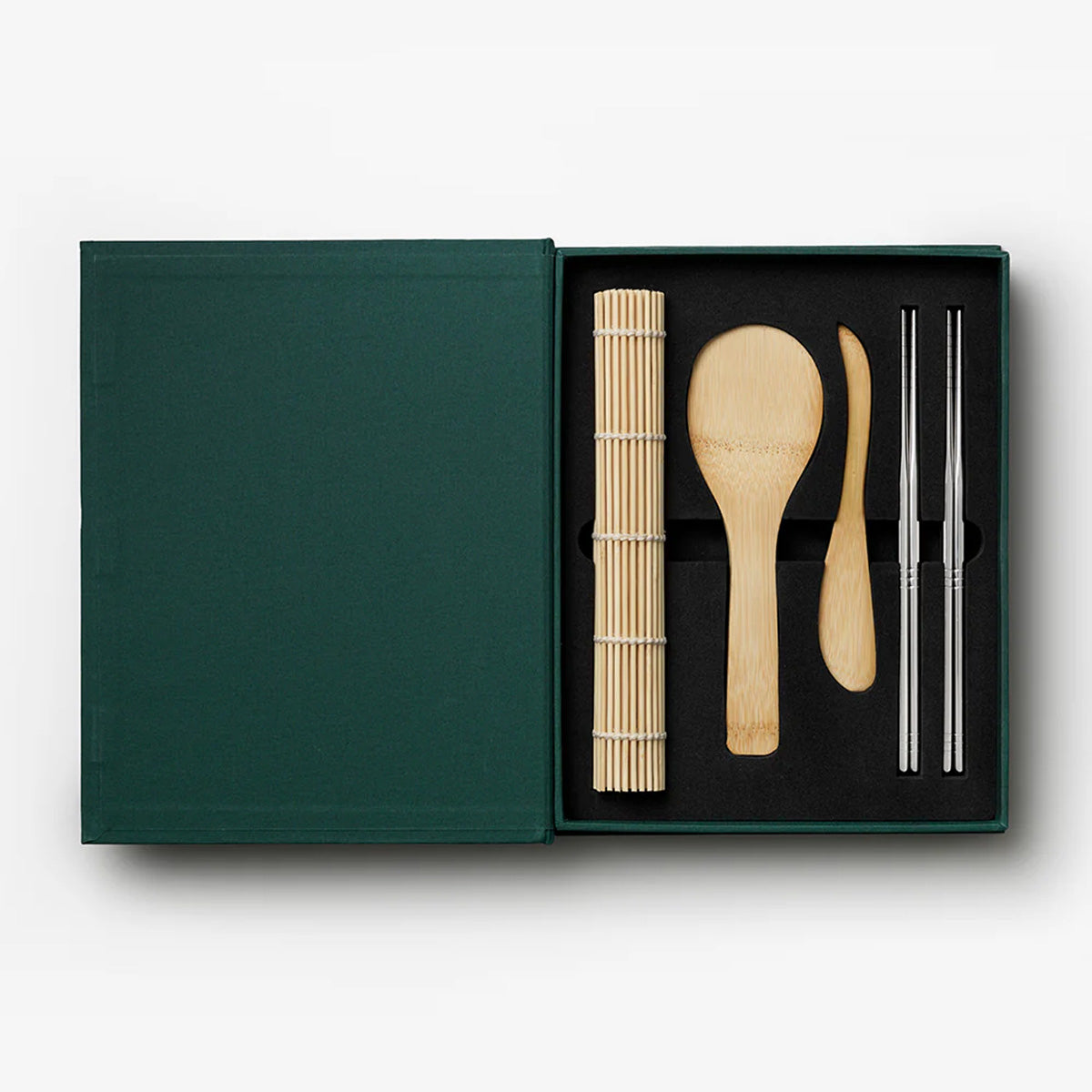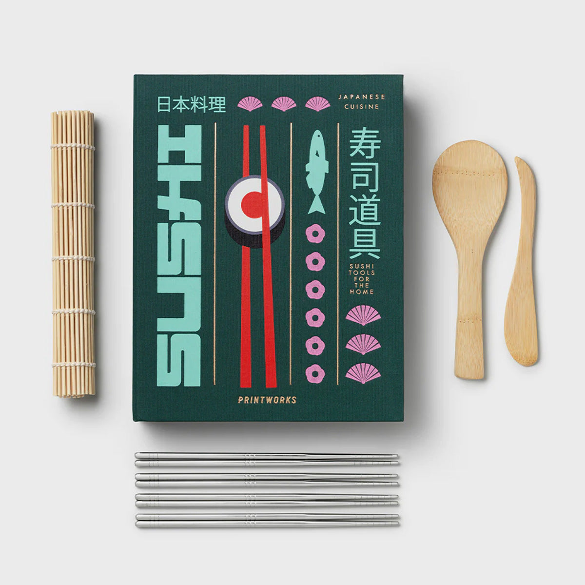 Das Sushi Tools Set von Printworks ist das perfekte Starter-Kit für selbstgemachtes Sushi – stilvoll verpackt in einer Box, die aussieht wie ein edles Kochbuch. Beim Öffnen kommt alles zum Vorschein, was du für den nächsten Sushi-Abend brauchst: ein Reislöffel und ein Aufstrichmesser aus Bambus, eine Rollmatte und acht Essstäbchen. Alle Werkzeuge sind robust, aus Edelstahl gefertigt und spülmaschinenfest. Ein schönes Geschenk – oder einfach ein Grund, öfter Sushi zu rollen.