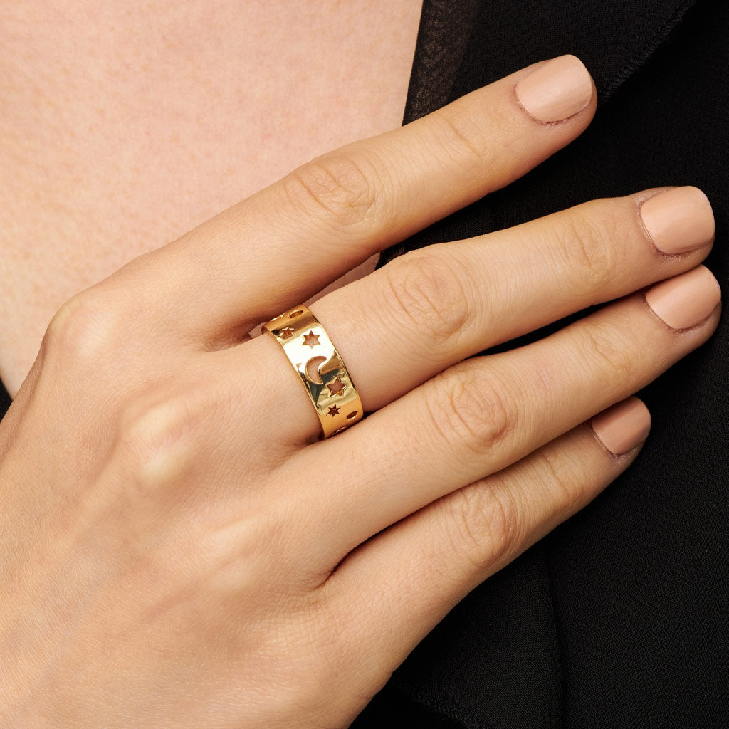 Wir alle kommen von den Sternen! Der Ring ist eine Hommage an das Universum, das den Sternenstaub geschaffen hat, aus dem wir alle stammen. Wir empfehlen, eine Nummer größer zu wählen, da der Ring breiter ist als andere Ringe aus der LULU Kollektion.
