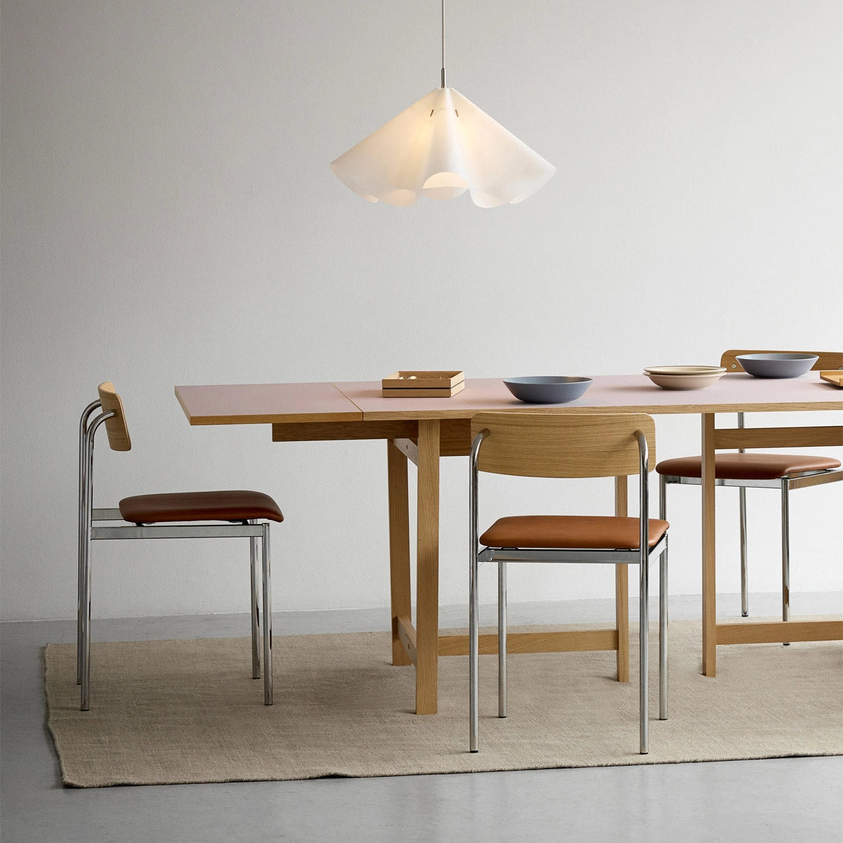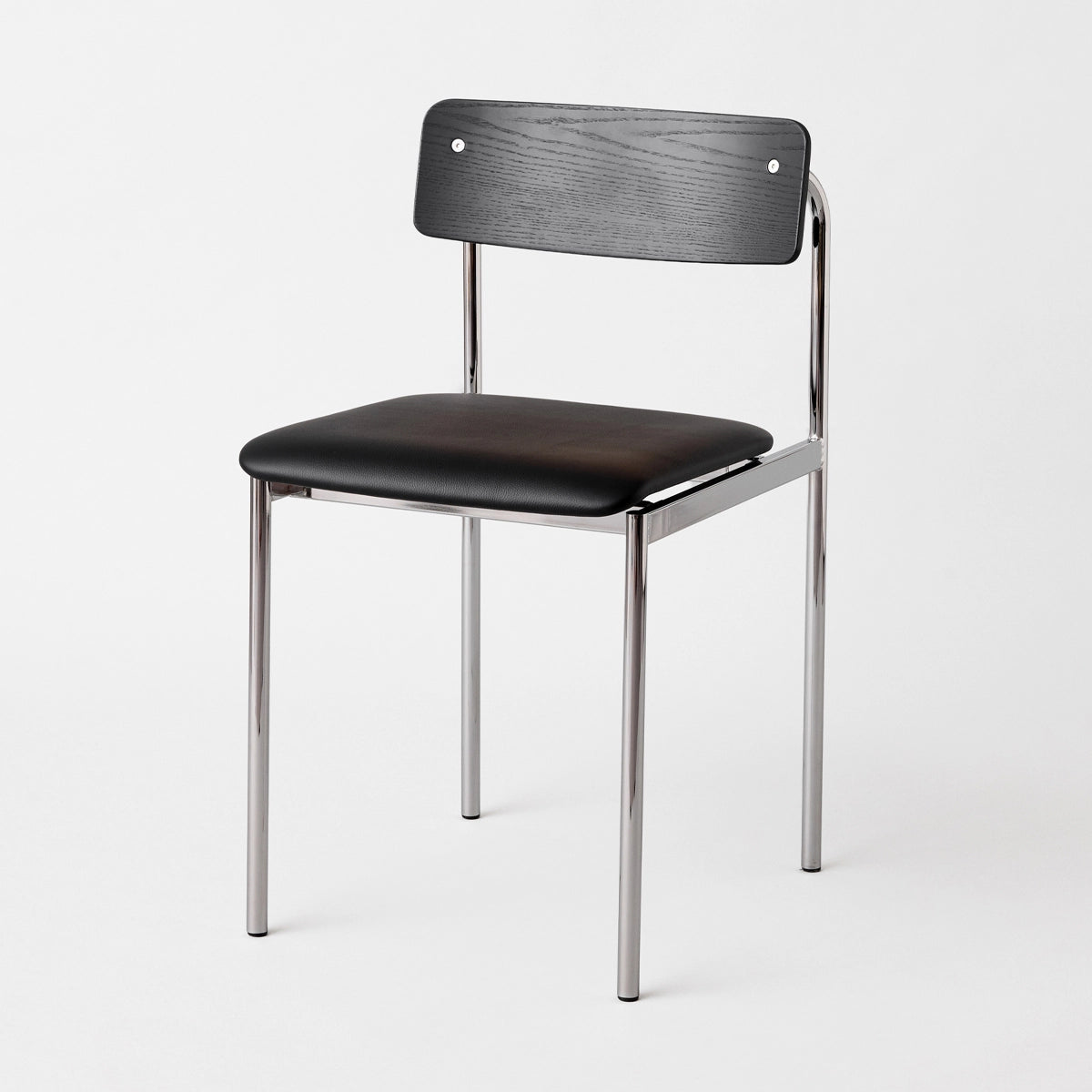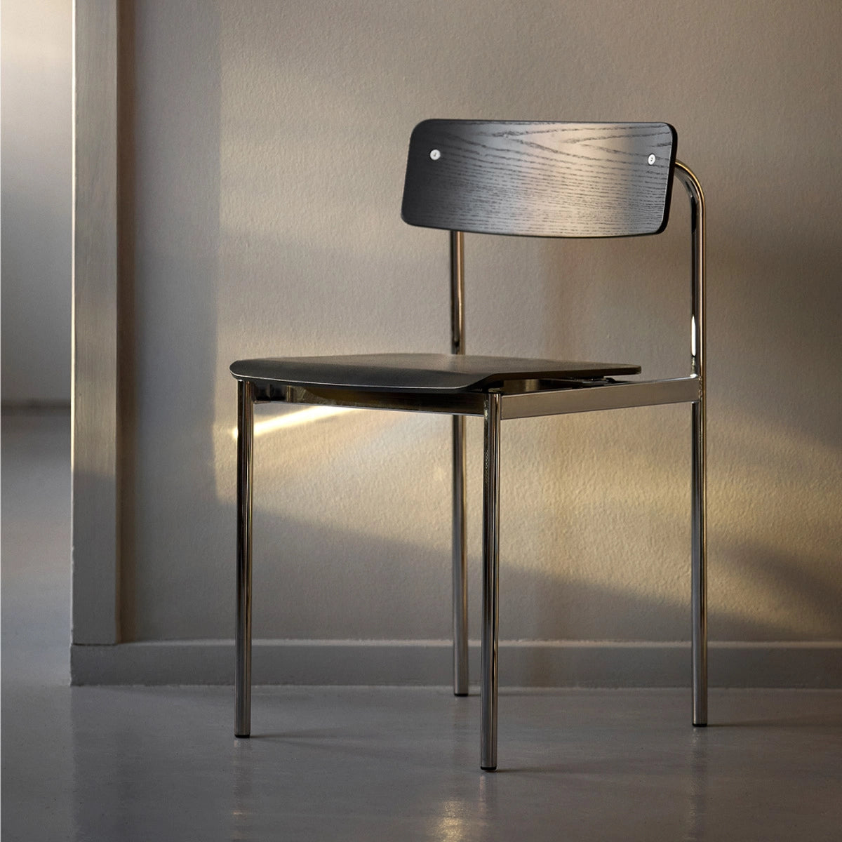 Ein Esszimmerstuhl, der durch seine starke visuelle Präsenz und klaren Linien besticht: Der Offset Chair von MOEBE vereint skulpturales Design mit hohem Sitzkomfort. Sein markantes Profil wird durch zwei durchgehende Stahllinien in Chrom oder Schwarz definiert. Die hinteren Beine schwingen elegant nach vorne, um die Rückenlehne zu stützen – ein Detail, das dem Stuhl seinen Namen und seinen leichten, offenen Ausdruck verleiht.