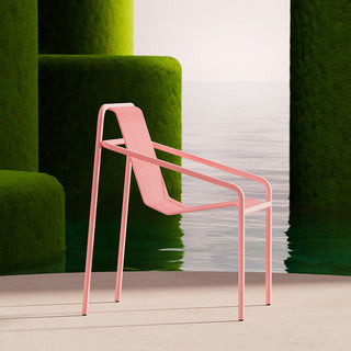 Zwischen Tisch und Sitzmöbeln entsteht ein Wechselspiel aus Transparenz und Materialdichte, das in der Sonne ein fantasievolles Farbspektrum erzeugt. Silbernes Besteck funkelt sanft im Licht, während eine Wasserperle auf dem Glas ihren Weg zum Tisch sucht. Dort trifft sie auf die Farben der Kollektion: Sienna Red und Soft Pink. Sie entwickeln eine besondere Ästhetik wenn sie mit dem Grün der Natur oder der städtischen Architektur interagieren. Sie sind eine Befreiung von den Zwängen des Interieurs, wo wir immer nach Bezügen zu anderen Farben suchen müssen. Draußen sind sie frei.