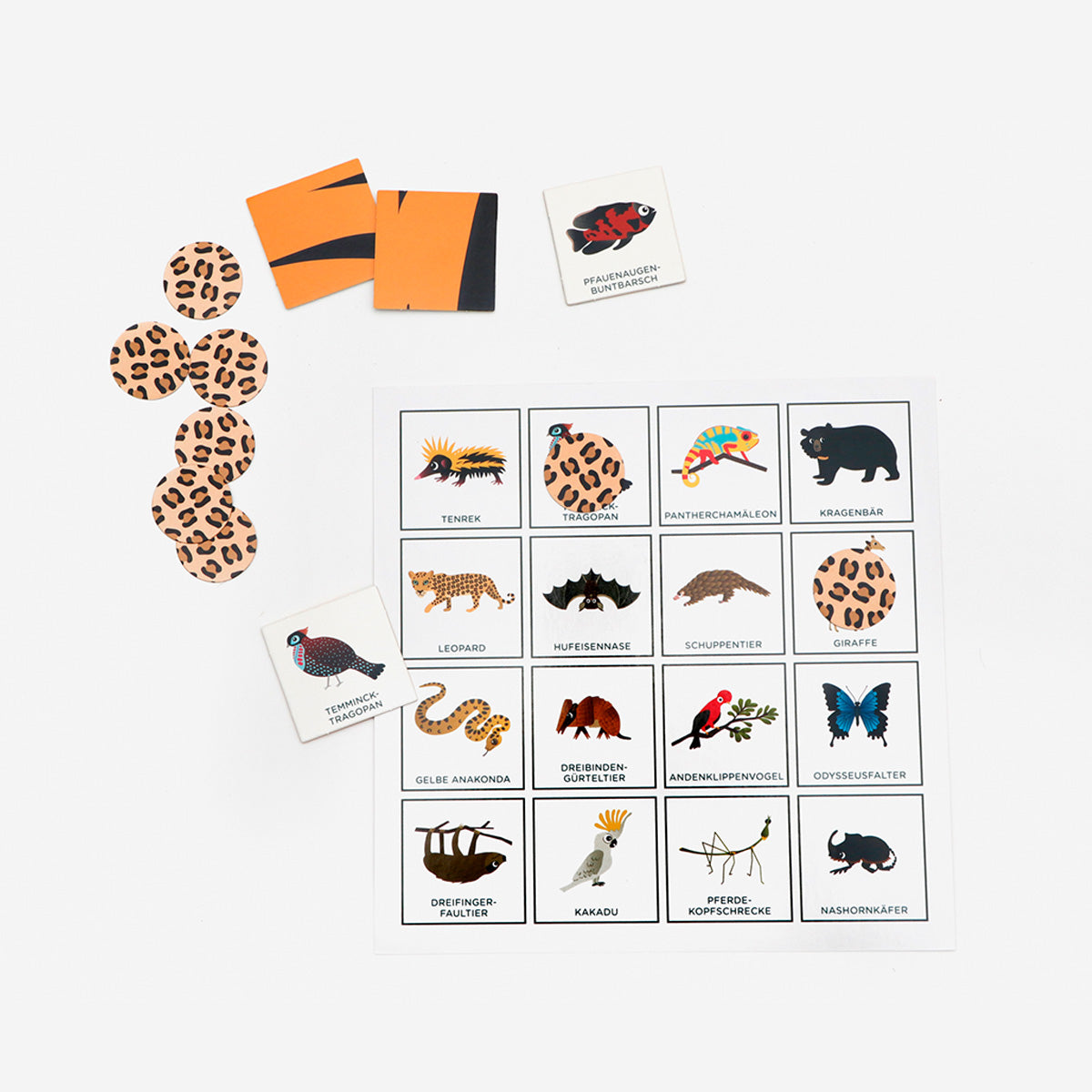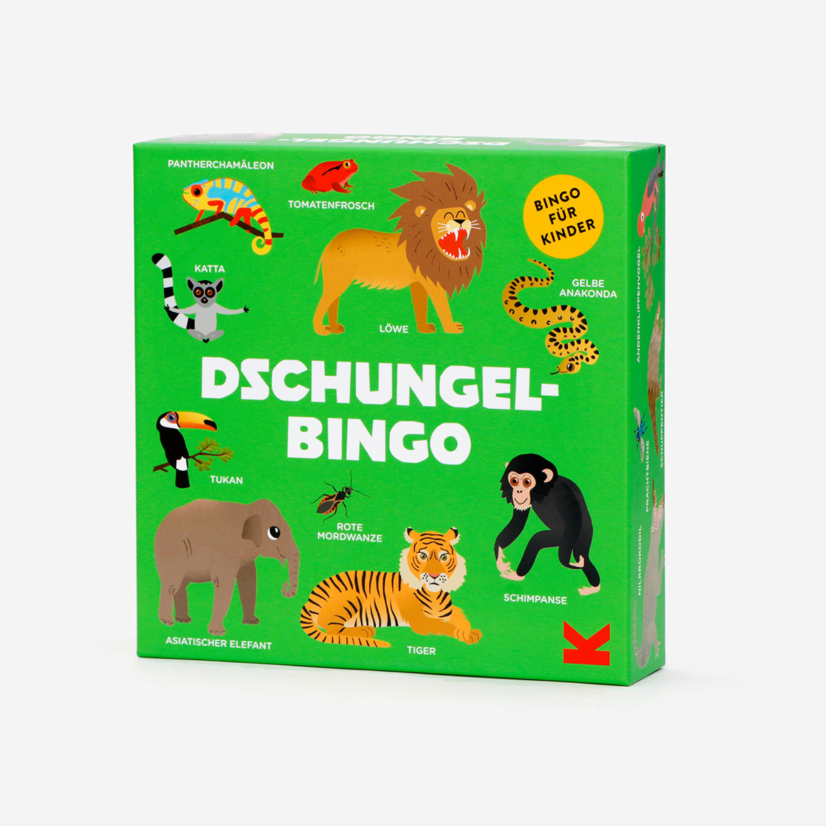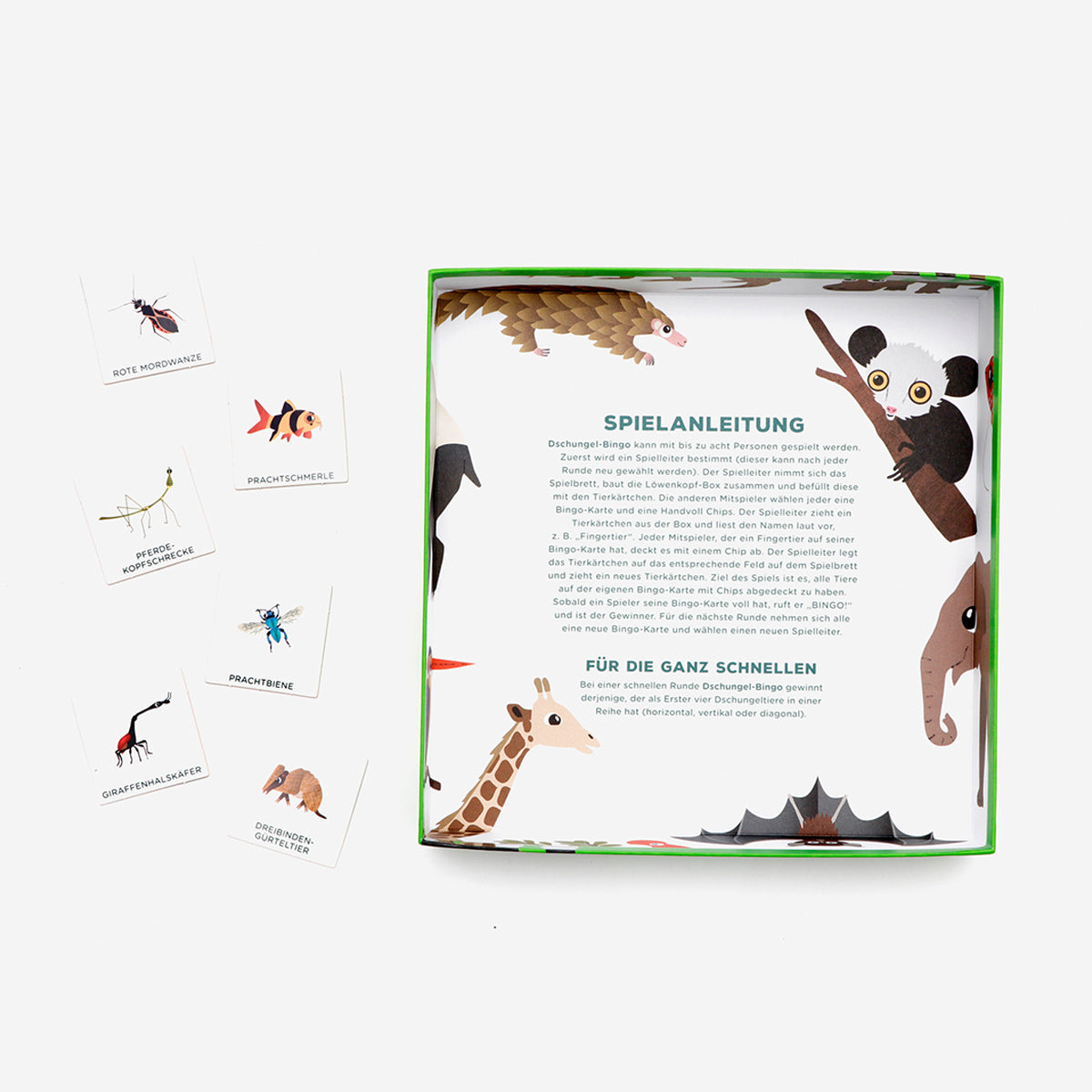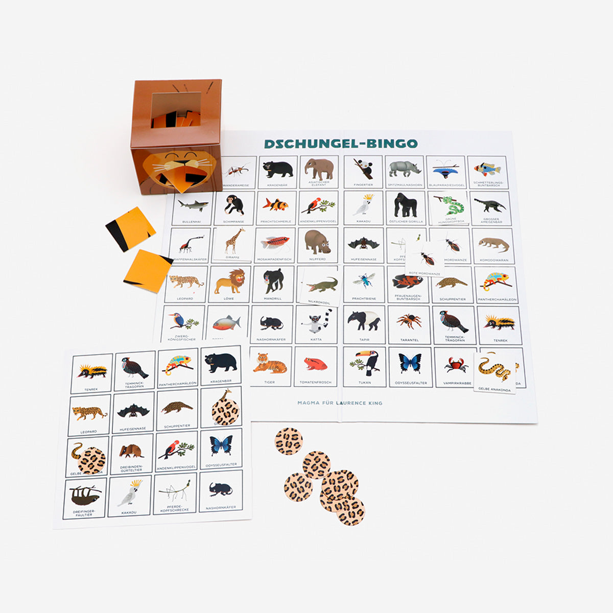 Das Dschungel-Bingo enthält 48 illustrierte Tierchips und den Kopf eines Dschungelbewohners aus Pappe zum Aufbewahren, ein Spielbrett und acht doppelseitige Bingo-Karten.