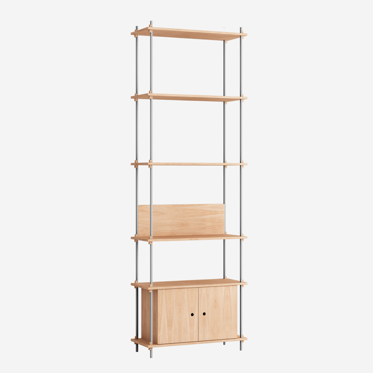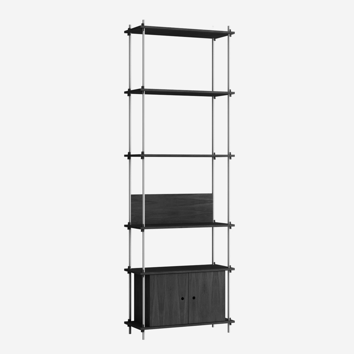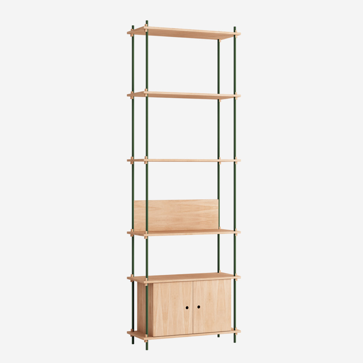 Die Böden und Schrankmodule sind in Eiche Natur und geräuchert, in Schwarz und in Weiß verfügbar. Die Stangen gibt es neben klassischem Schwarz und Weiß auch in Deep Blue, Pine Green, Warm Grey. Durch die Kombination verschiedener Längen, die fast unsichtbar ineinander geschraubt werden, ist fast jede individuelle Höhe konfigurierbar.