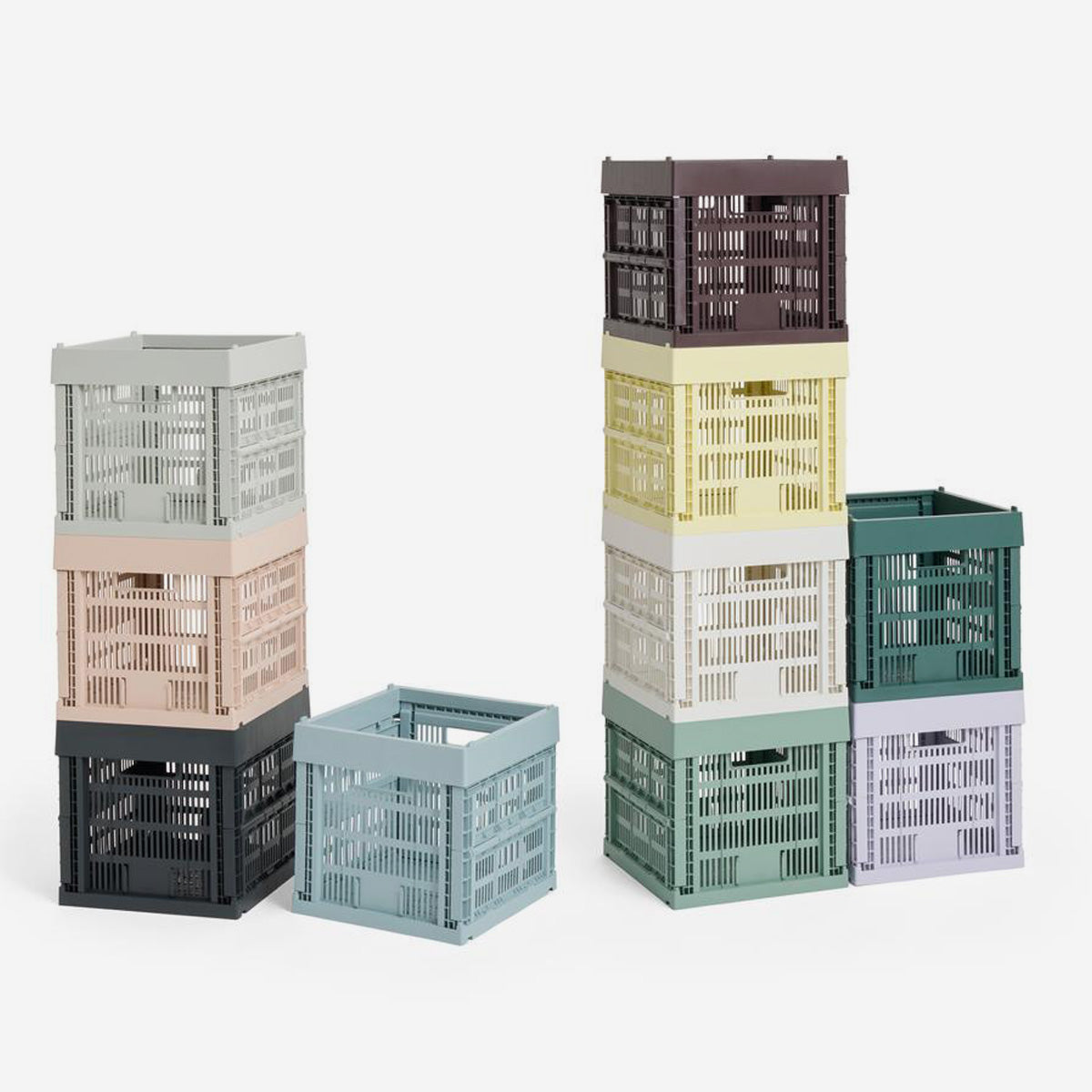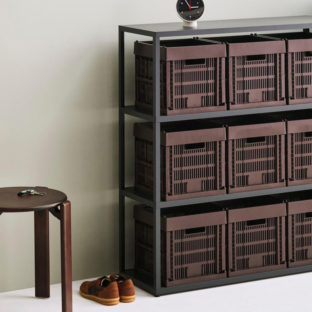 Die Colour Crates von HAY bringen Farbe und Ordnung ins Leben. Ob im Regal, auf dem Boden oder im Schrank – sie nehmen alles auf, was sonst herumliegt. Es gibt sie in vielen Größen und Farben, alle aus 100 % recyceltem Kunststoff. Sie lassen sich stapeln, ineinanderstellen und sogar flach zusammenfalten, wenn sie mal Pause haben. Mit passenden Deckeln oder Rollen werden sie zu praktischen Helfern oder kleinen Möbelstücken. Schlicht, flexibel und immer nützlich.