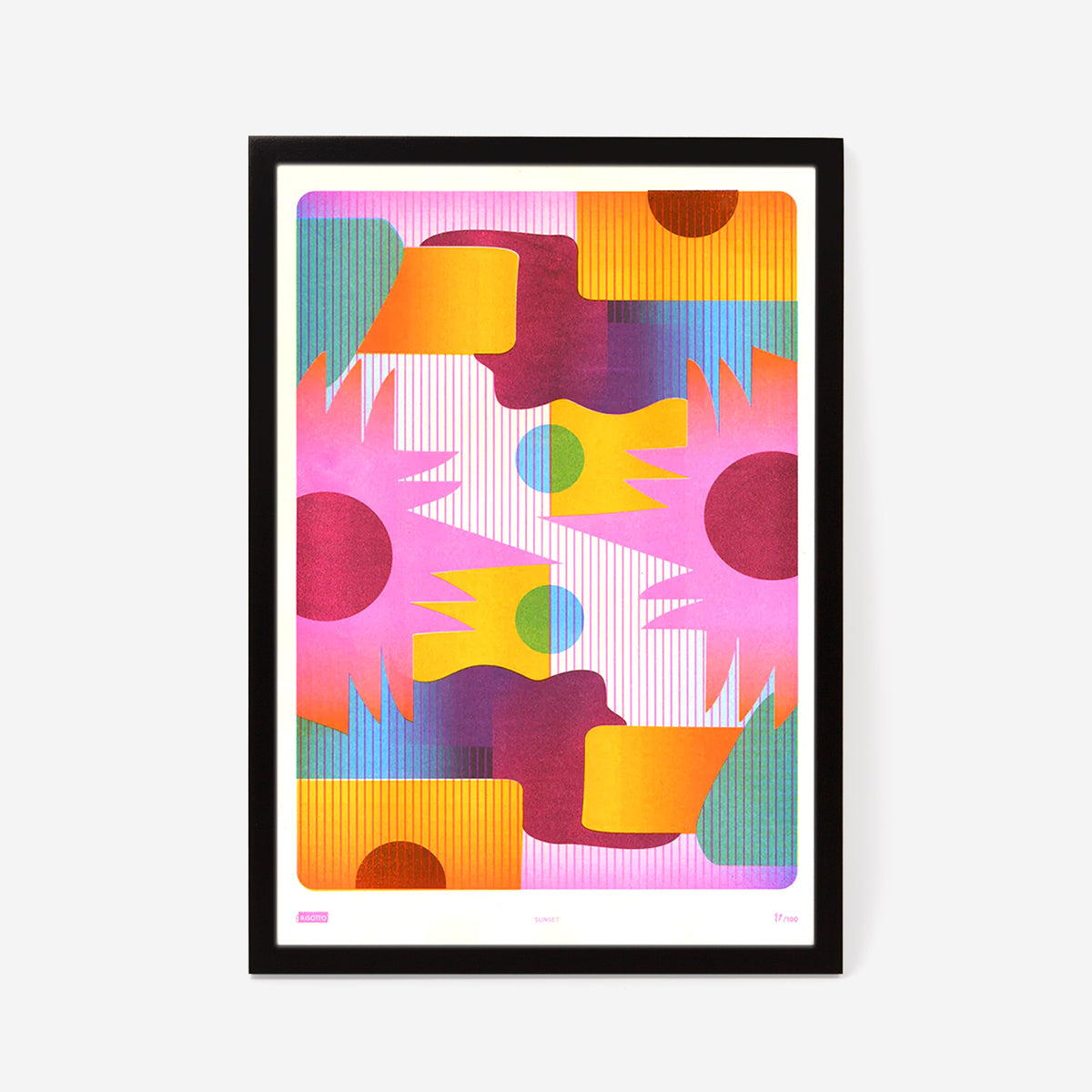 Der Druck aus der Repeats-Collection von Studio Risotto ist mit seinen vibrierenden, fluoreszierenden Farben ein leuchtender Hingucker an der Wand.