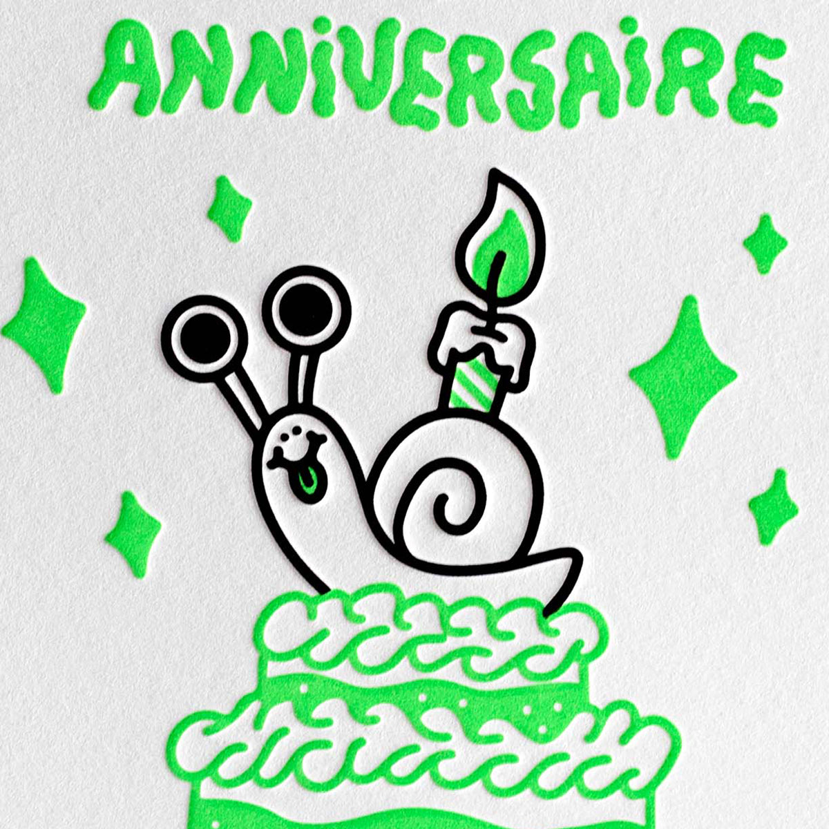 Zu spät ist manchmal genau richtig: die Joyeux Anniversaire en retard Grußkarte von Letterpress de Paris nimmt verspätete Glückwünsche mit Humor – mit einer kleinen Schnecke auf der Torte und einem Augenzwinkern in Neongrün.