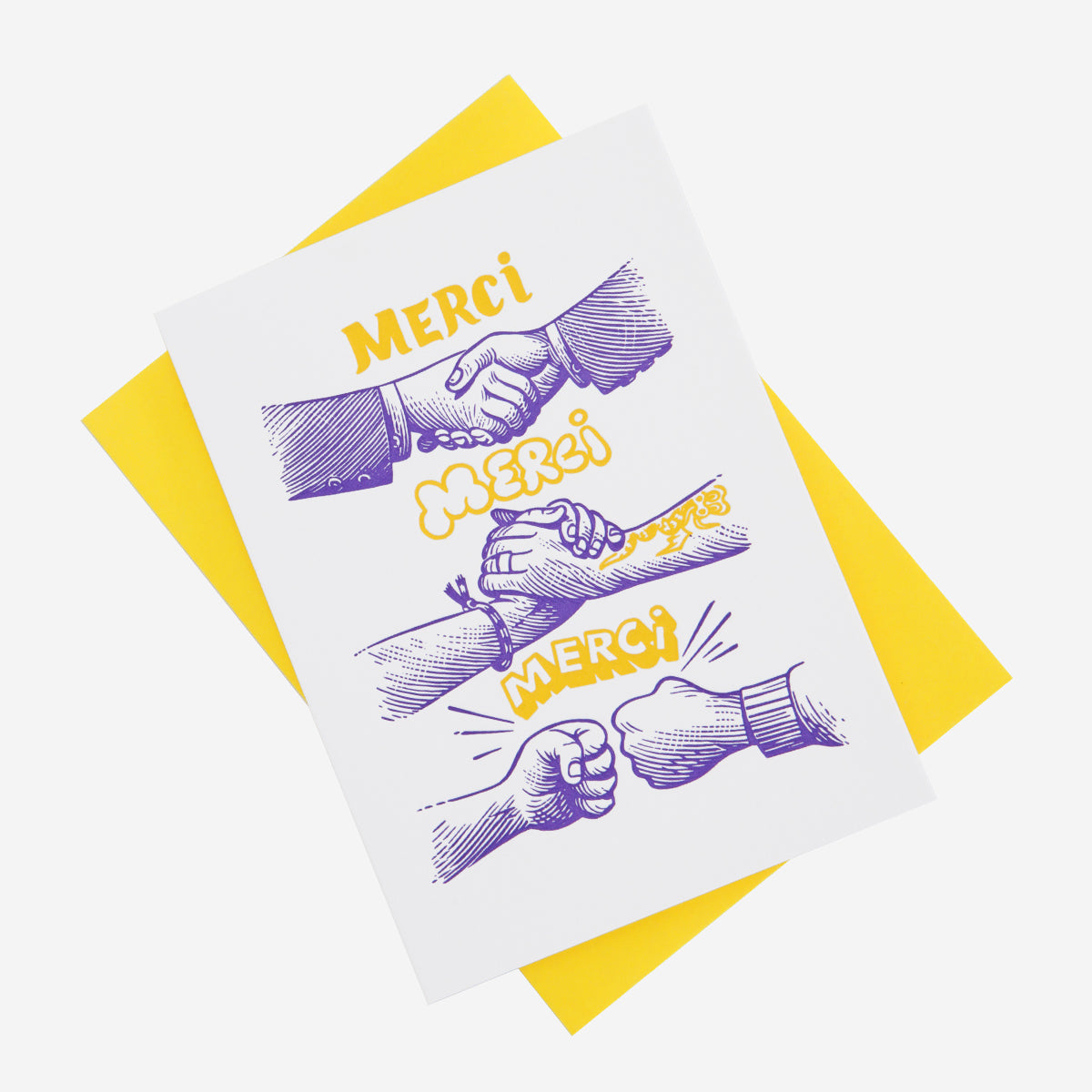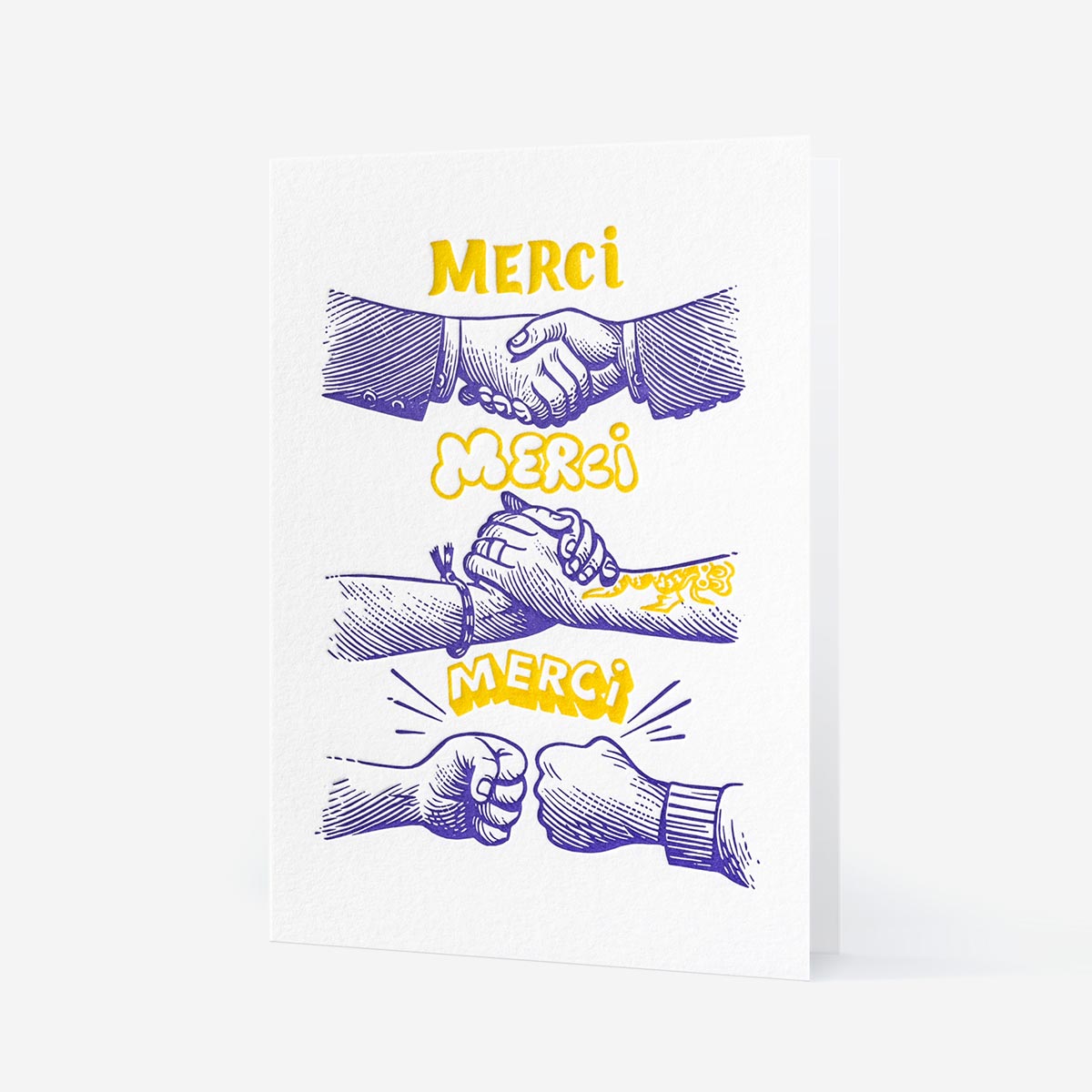 Einmal Danke sagen ist gut. Dreimal fühlt sich besser an. Die „Merci Merci Merci“ Grußkarte von Letterpress de Paris spielt mit kleinen Gesten – Handschlag, Griff, Fist Bump – und macht aus einem einfachen Danke eine ziemlich charmante Abfolge.