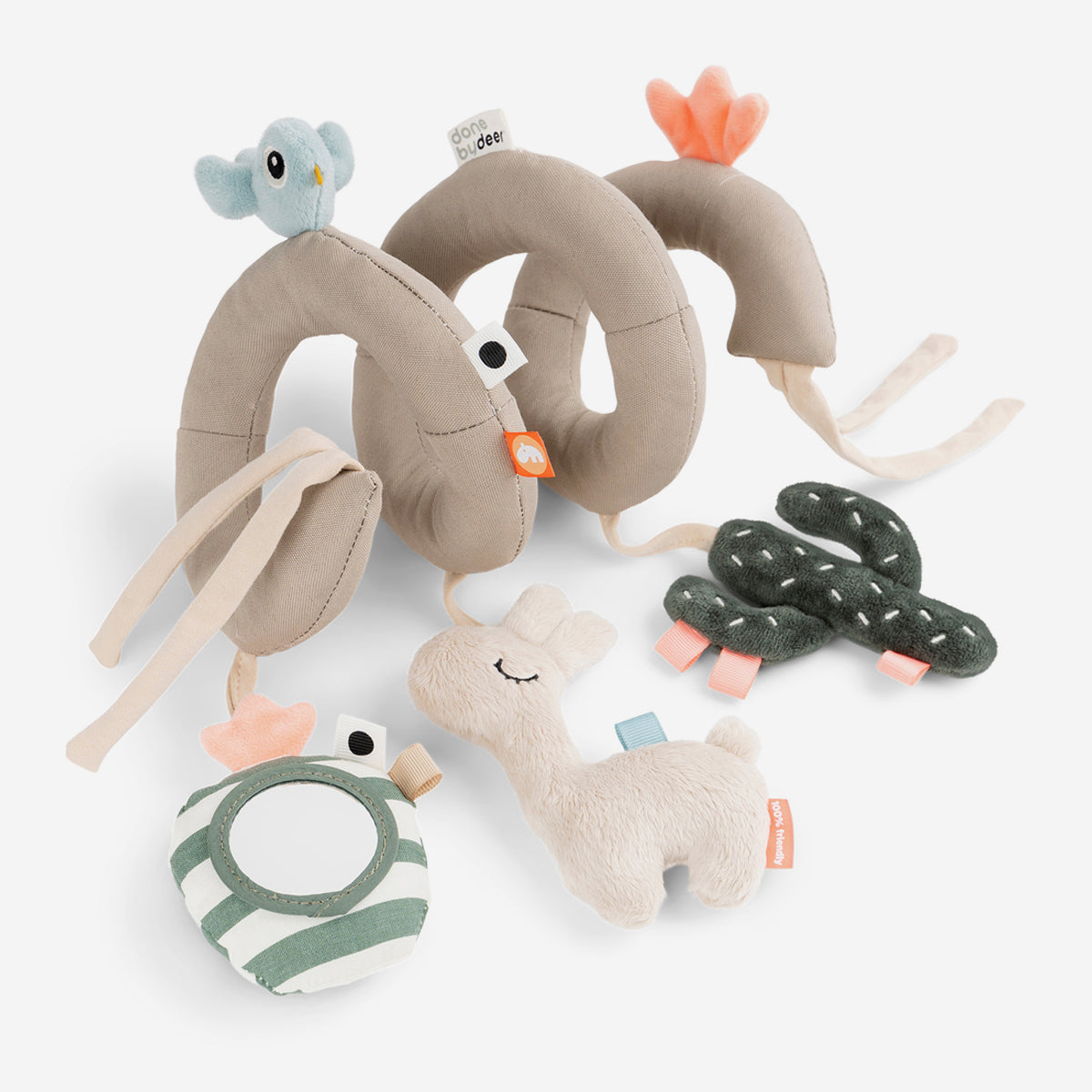 Die Activity Spirale Lalee von Done by Deer ist der perfekte Unterhaltungsspaß für unterwegs – mit vielen kleinen Sinneseindrücken zum Entdecken. Du kannst sie ganz einfach mit den weichen Bändern am Kinderbett, Autositz, Kinderwagen oder Buggy befestigen.