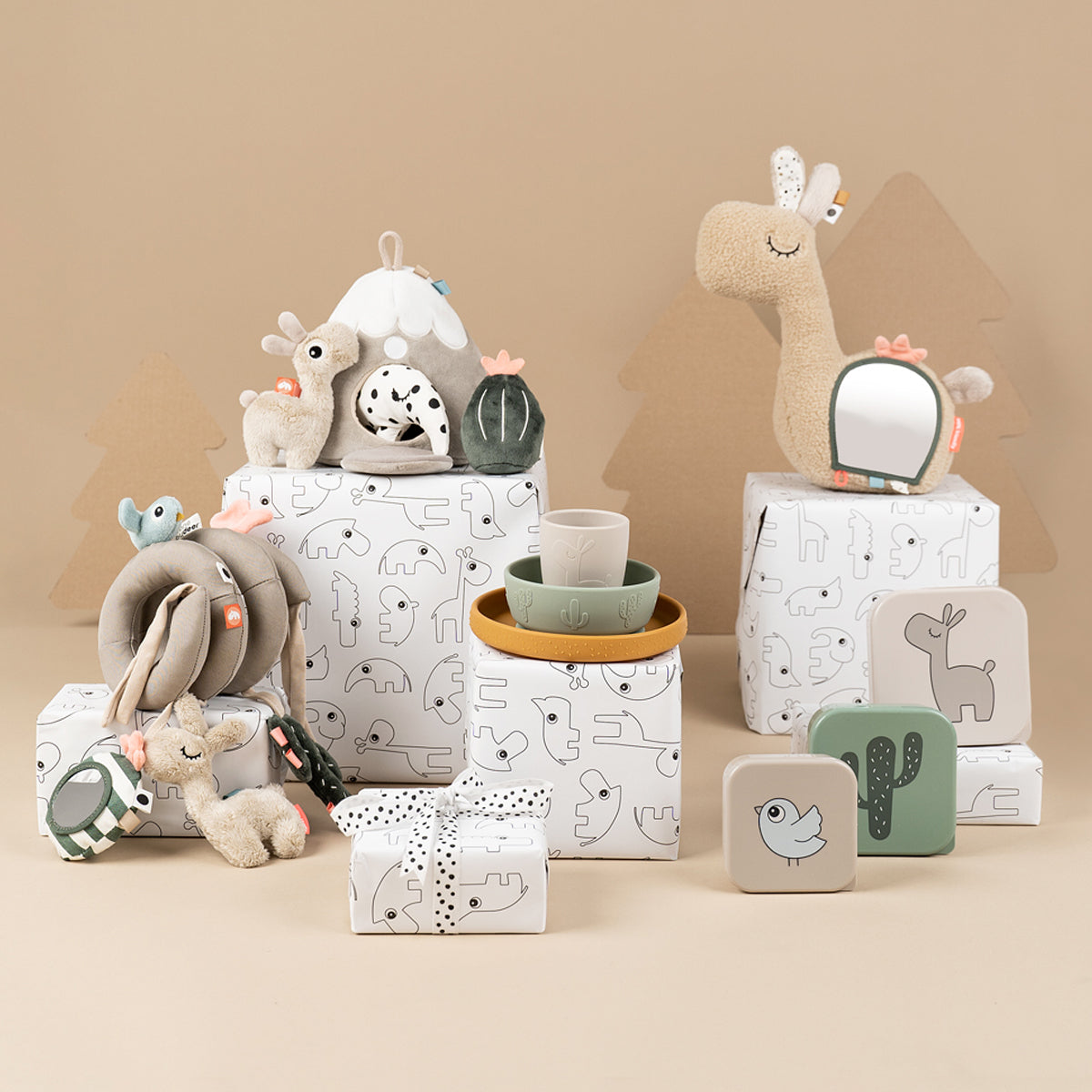 Kleine Finger erkunden die kuschelige Lalee, freuen sich über das knisternde Geräusch des Lamas oder schauen neugierig in den kleinen Spiegel. Auch der grüne Sinneskaktus und Birdee, der von oben herunterschaut, sorgen für Abwechslung. Die Farben sind ruhig gehalten: sandige Töne mit Details in Grün, Blau und einem kleinen Farbtupfer in Korallenrot