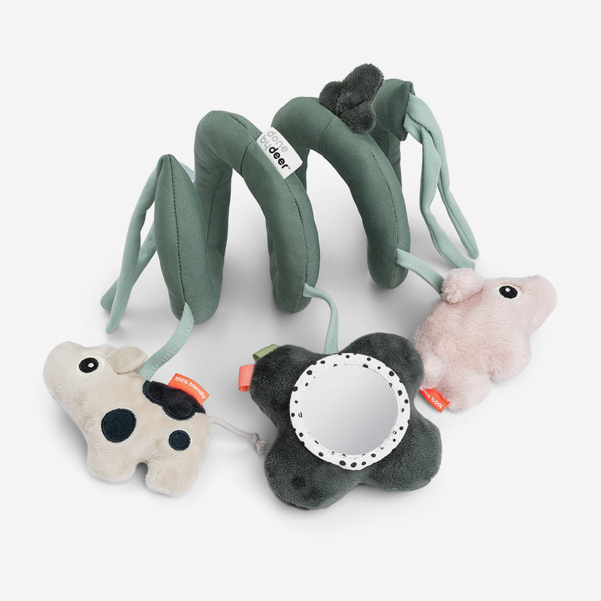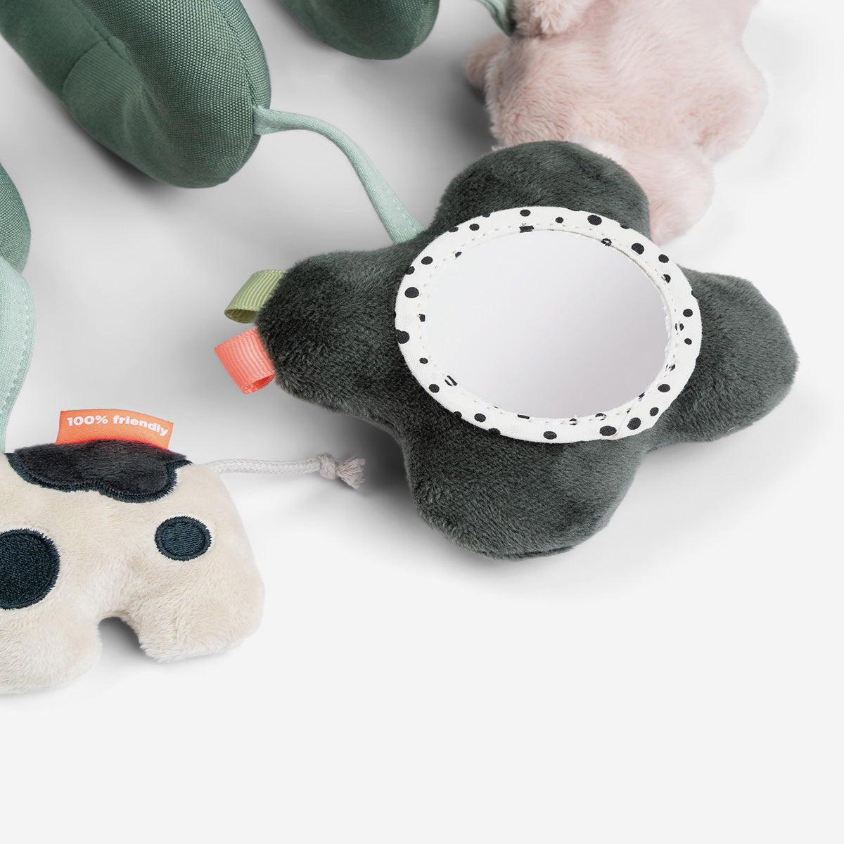 Die Spirale lässt sich mit weichen Bändern ganz leicht am Kinderbett, an der Babyschale oder am Kinderwagen befestigen. Und auch optisch ist was los: kühles Grün trifft auf bunte Details und verspielte Kontraste – für visuelle Reize, die nicht überfordern.