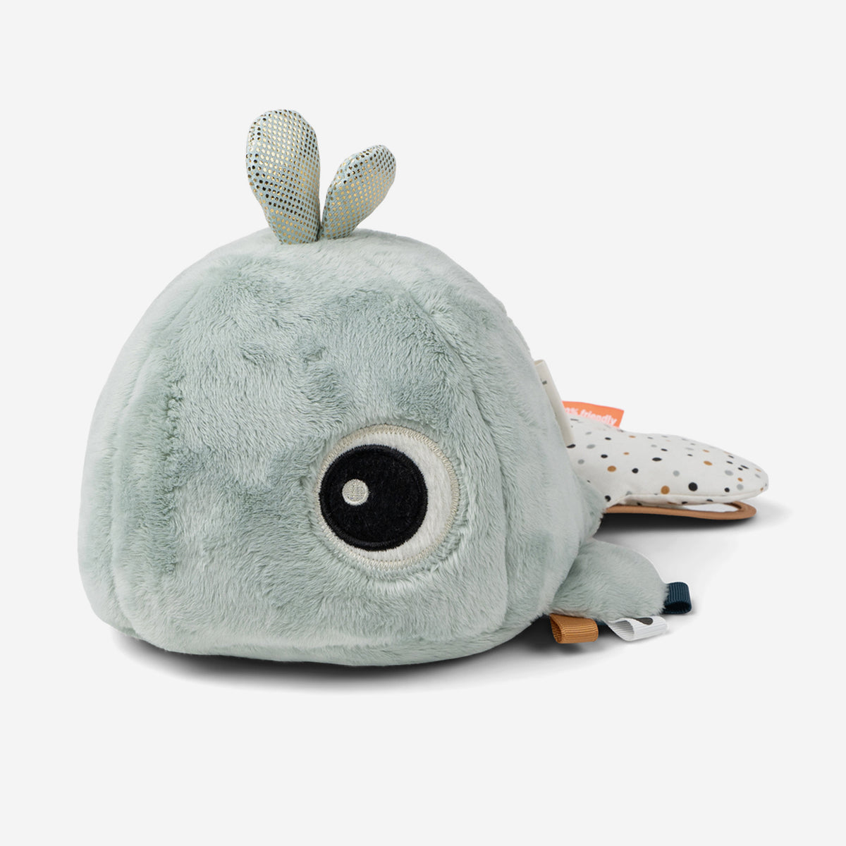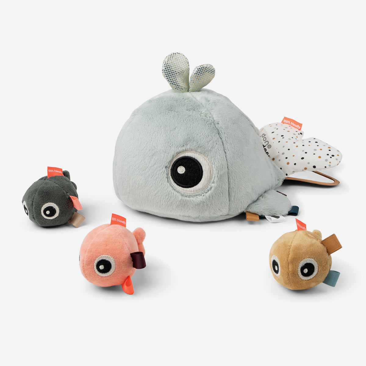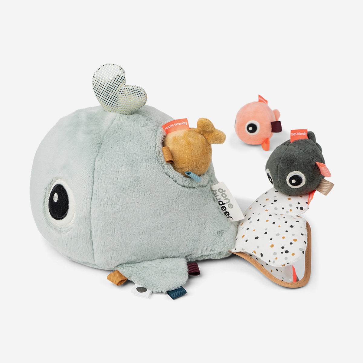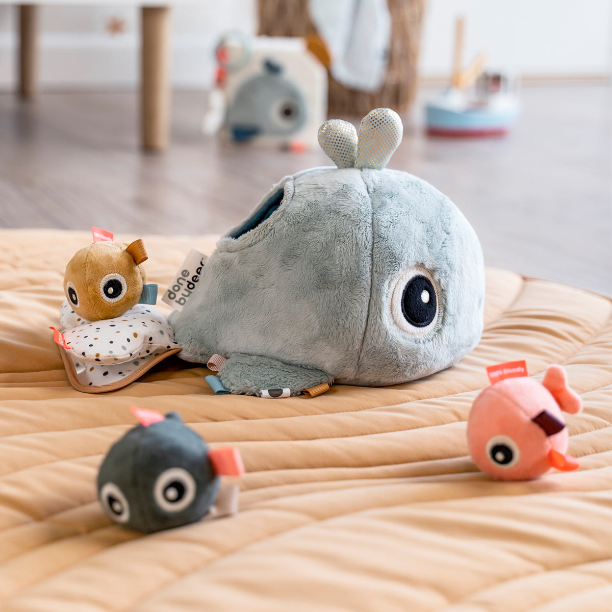 Das Versteckspiel Wally von Done by Deer bringt Bewegung, Neugier und jede Menge Entdeckerfreude ins Spielzimmer. Der weiche Wal in frischem Minzblau hat es in sich – oder besser gesagt: in sich versteckt. Drei bunte Fischfreunde verstecken sich in Wallys Bauch – jeder macht ein anderes Geräusch: einer rasselt, einer knistert, einer bimmelt. Rollen sie davon, lädt das zum Hinterherkrabbeln ein. Dazu gibt’s spannende Texturen, einen versteckten Spiegel, lustige Etiketten und eine kleine Wasserfontäne am Kopf – alles, was kleine Hände und wache Sinne beschäftigt.