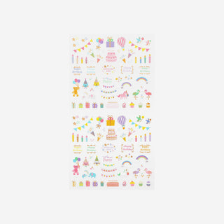 Feiere jeden Moment! Diese Mini-Sticker von Midori bringen Party-Stimmung in deinen Kalender, dein Notizbuch oder Tagebuch. Mit niedlichen Motiven wie Torten, Luftballons, Geschenken und funkelnden Kerzen kannst du Geburtstage, Jahrestage oder besondere Meilensteine stilvoll markieren.