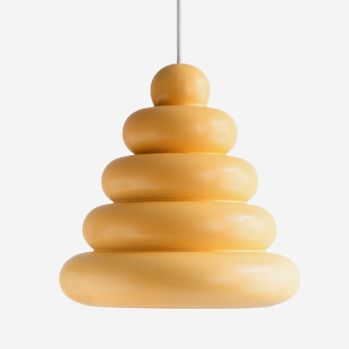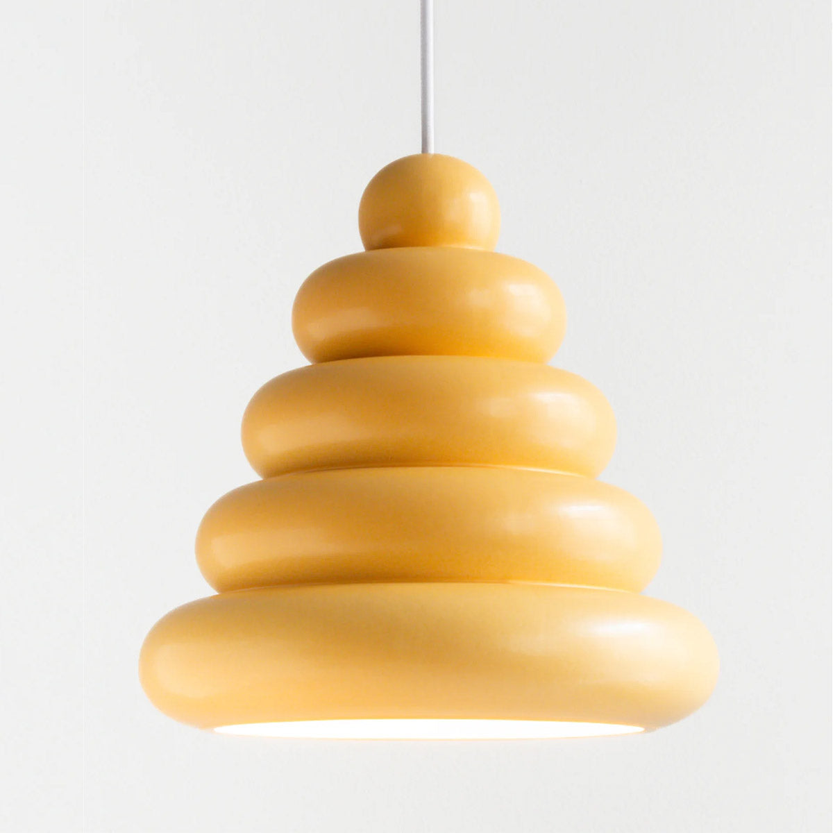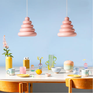 Die Bubble Lamp von Studio Arhoj verbindet charmantes Retro-Design mit handwerklicher Perfektion. Inspiriert von klassischen Wackelpudding-Formen, Googie-Architektur und dänischen Lagkager (Schichttorten) entsteht ein einzigartiger Lampenschirm aus handgegossenem Steinzeug. Jede Lampe wird glasiert und gebrannt, wodurch sie eine lebendige, glänzende Oberfläche erhält.