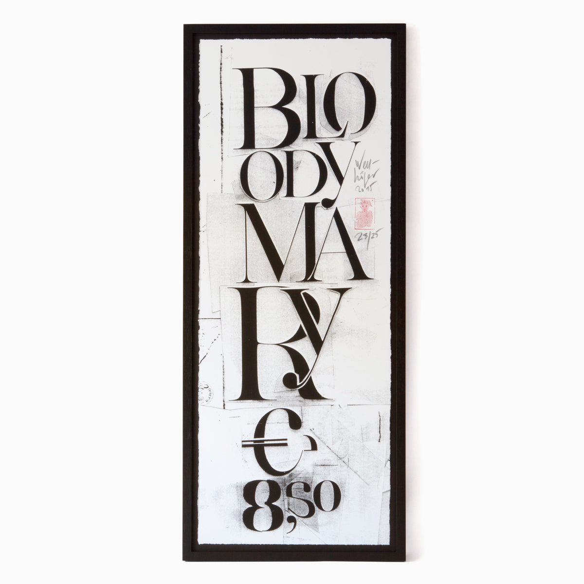The "Absinthe" and the "Bloody Mary" are slim portrait formats of 36 × 96 cm (14.2 × 37.8"). "Beuys & Girls", "French" and the "Speculant" are landscape formats of 66 × 96 cm (26 × 37.8").
