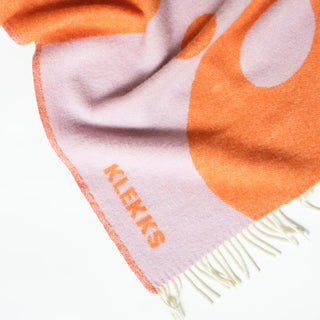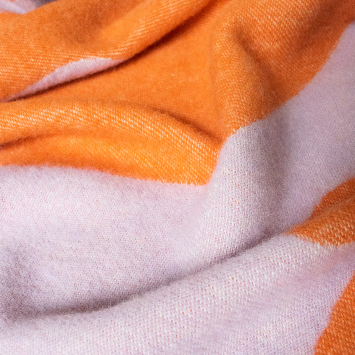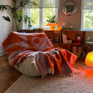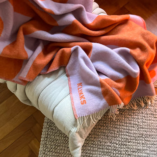 Für gemütliche Stunden zuhause: mit der Klekks No. 8 Orange-Rosa Wolldecke wird dir warm ums Herz und bunt im Wohnzimmer.