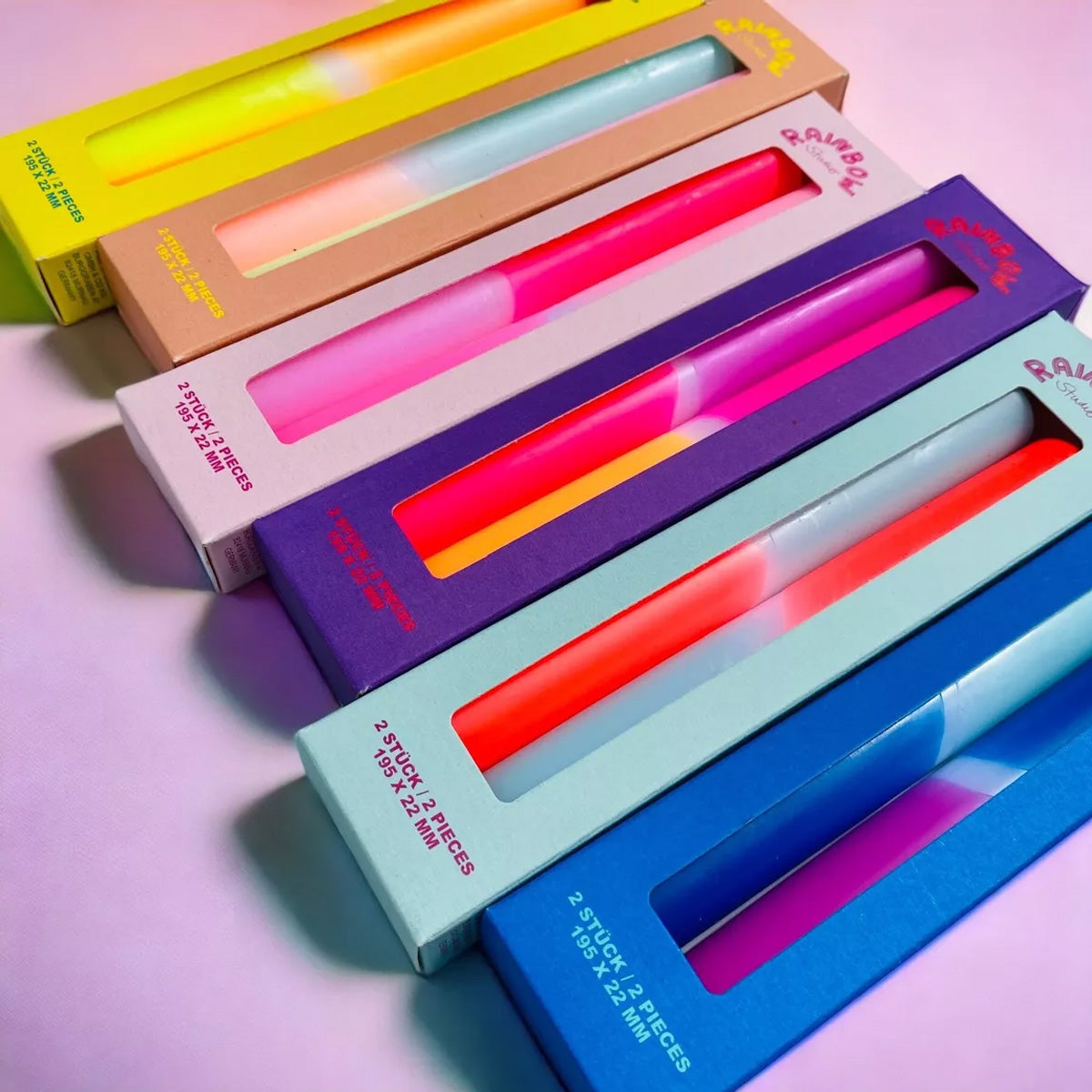 Bunt, bunter, Rainbow Studio! Die fröhlichen, liebevoll handgefärbten Kerzen von Pink Stories in ihren bunten Verpackungen heitern jedes Interieur auf. Jedes Stück ein Unikat: die Farbverläufe variieren bei jeder einzelnen Kerze und unterstreichen die Einzigartigkeit.