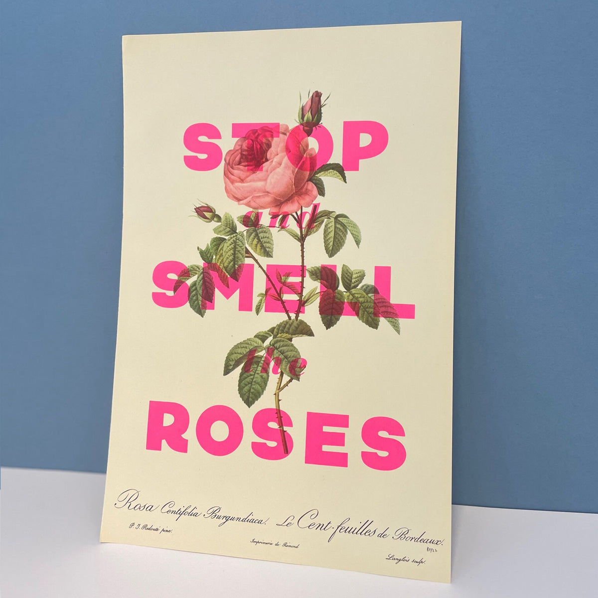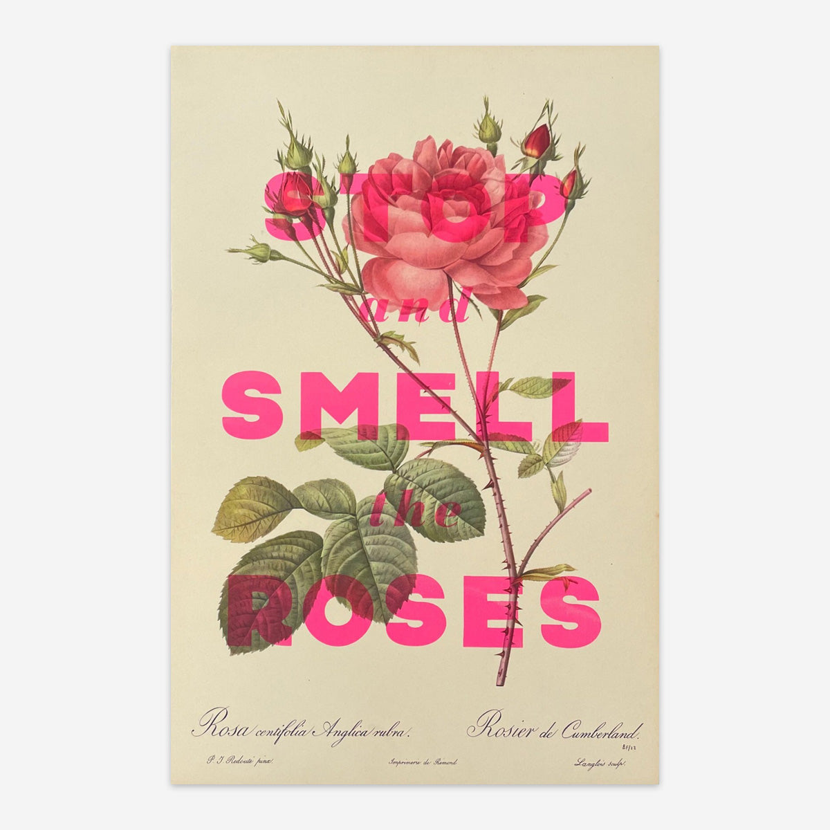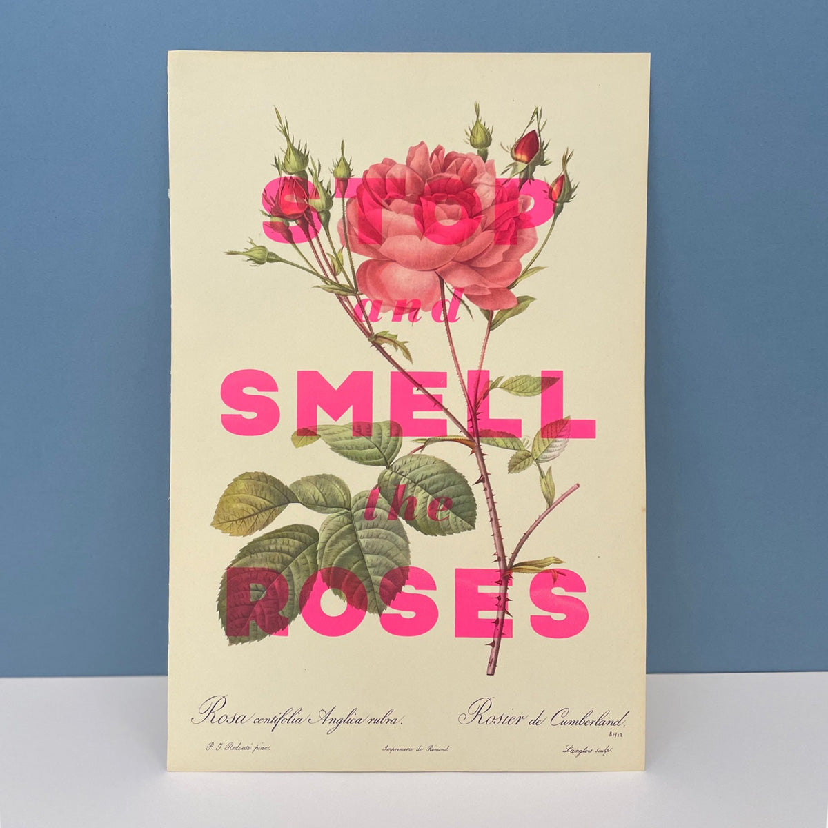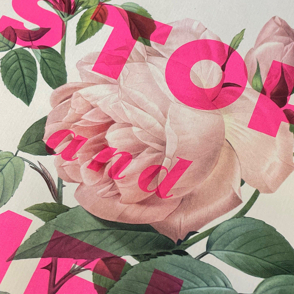 Stop and smell the roses. Siebdruck auf alte Buchseiten mit Rosenillustrationen von P.J Redouté von 1955.