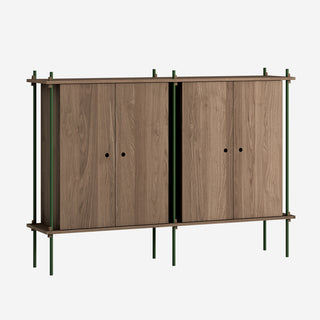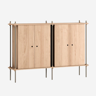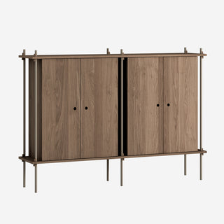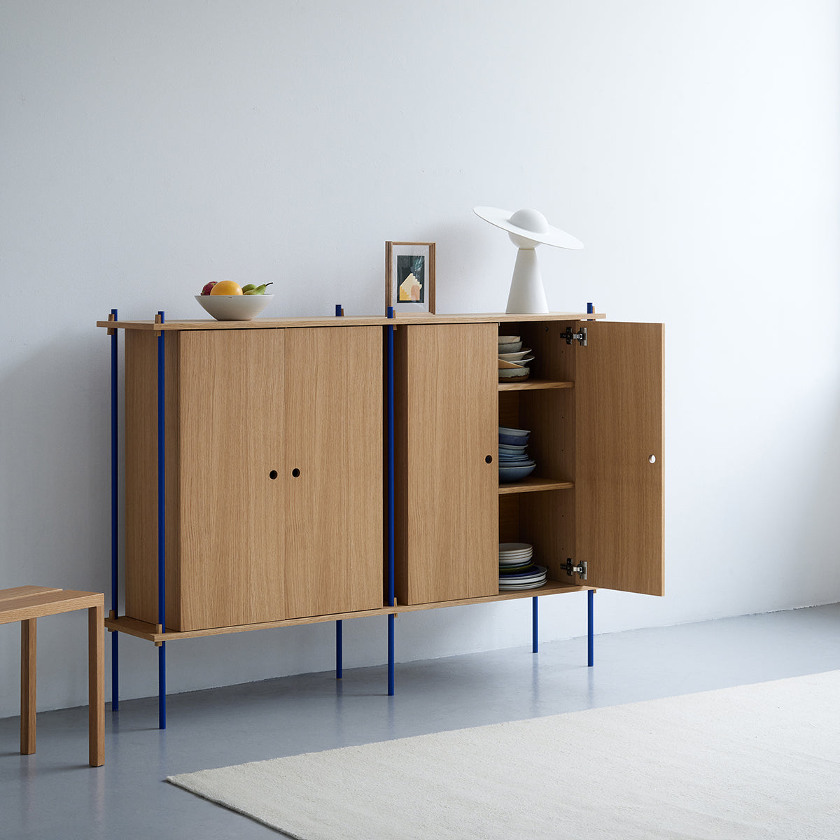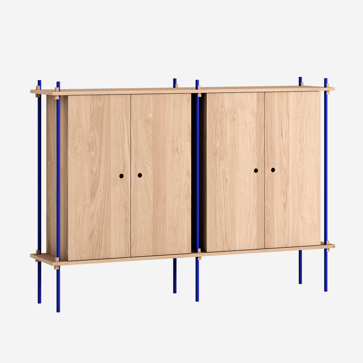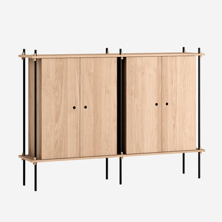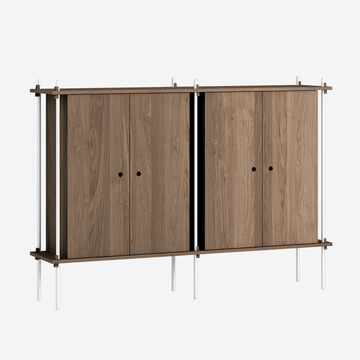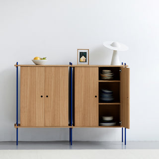 Die Böden und Schrankmodule sind in Eiche Natur und geräuchert, in Schwarz und in Weiß verfügbar. Die Stangen gibt es neben klassischem Schwarz und Weiß auch in Deep Blue, Pine Green, Warm Grey. Durch die Kombination verschiedener Längen, die fast unsichtbar ineinander geschraubt werden, ist fast jede individuelle Höhe konfigurierbar.