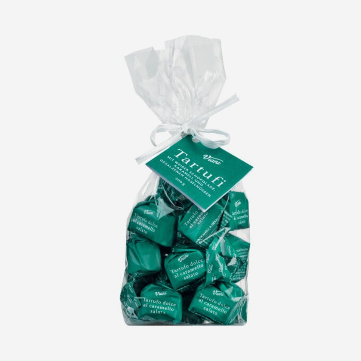 Im hellen Schokoladentrüffel sind Karamell und gesalzene Haselnussstückchen verarbeitet. Der zarte Salzton unterstreicht die gute Schokolade. Eine Köstlichkeit im Geschenkbeutel.