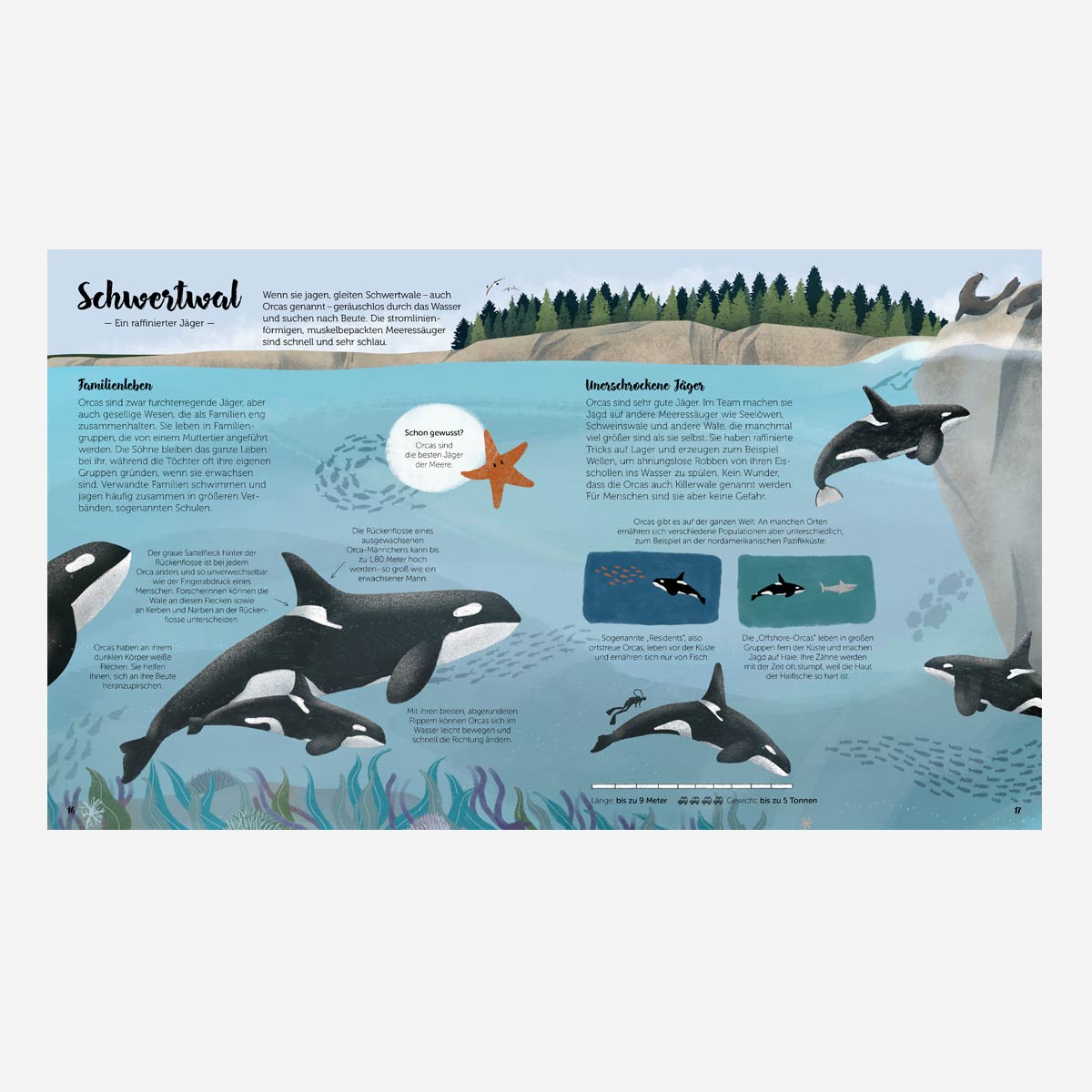 Stimmt es, dass Grönlandwale über 200 Jahre alt werden können und Pottwale das größte Gehirn der Welt haben? Halten Wale unter Wasser die Luft an und wie verständigt sich ein Blauwal mit seinen Artgenossen? Mit diesem eindrucksvoll bebilderten Buch können Kinder die Giganten der Ozeane kennenlernen und alles über ihren Alltag, Sozialverhalten, Kommunikationswege und Ernährungsgewohnheiten erfahren. Überblickskapitel zu unterschiedlichsten Themen und ein Glossar versammeln Hintergrundwissen zum Leben unter Wasser, außerdem gibt es zahlreiche Anregungen und Ideen zum Schutz der Meere.