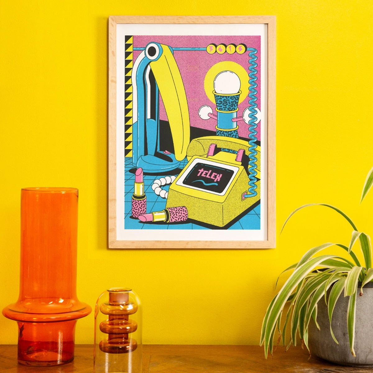 Mitten aus der Neonwelt der 80er kommt „3615 Telex“ – ein Kunstdruck des französischen Künstlers Freak City. In seinem unverwechselbaren Stil, irgendwo zwischen Punk, Skatekultur und Sci-Fi-Comic, erschafft er eine schrille Parallelwelt, in der Lippenstifte neben Röhrentelefonen stehen und Maschinen ein Eigenleben entwickeln.