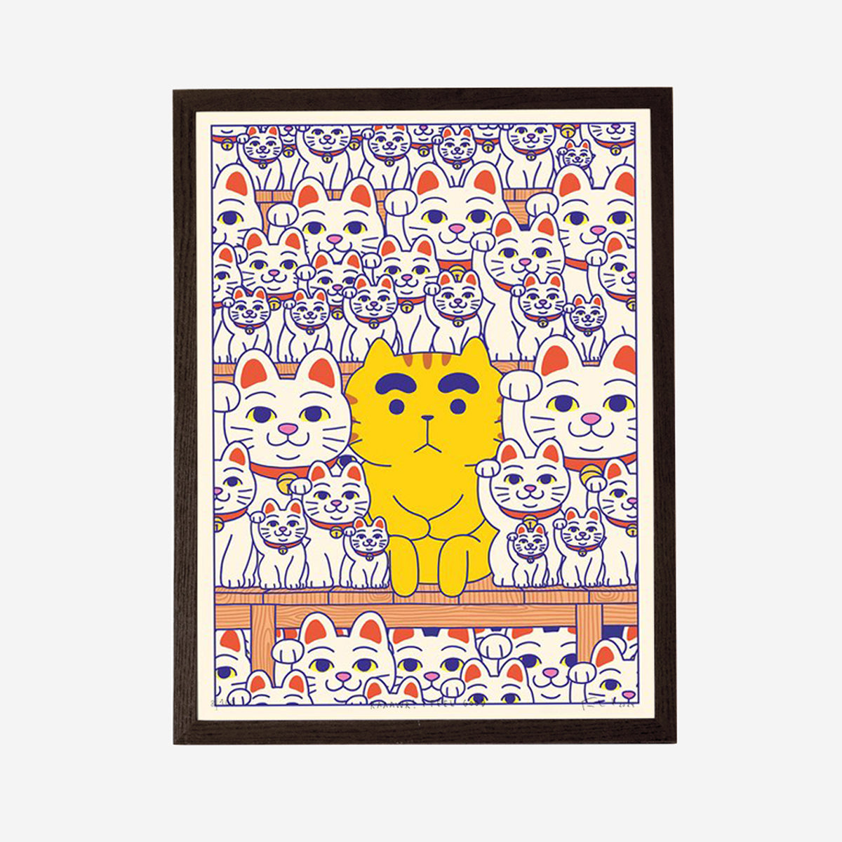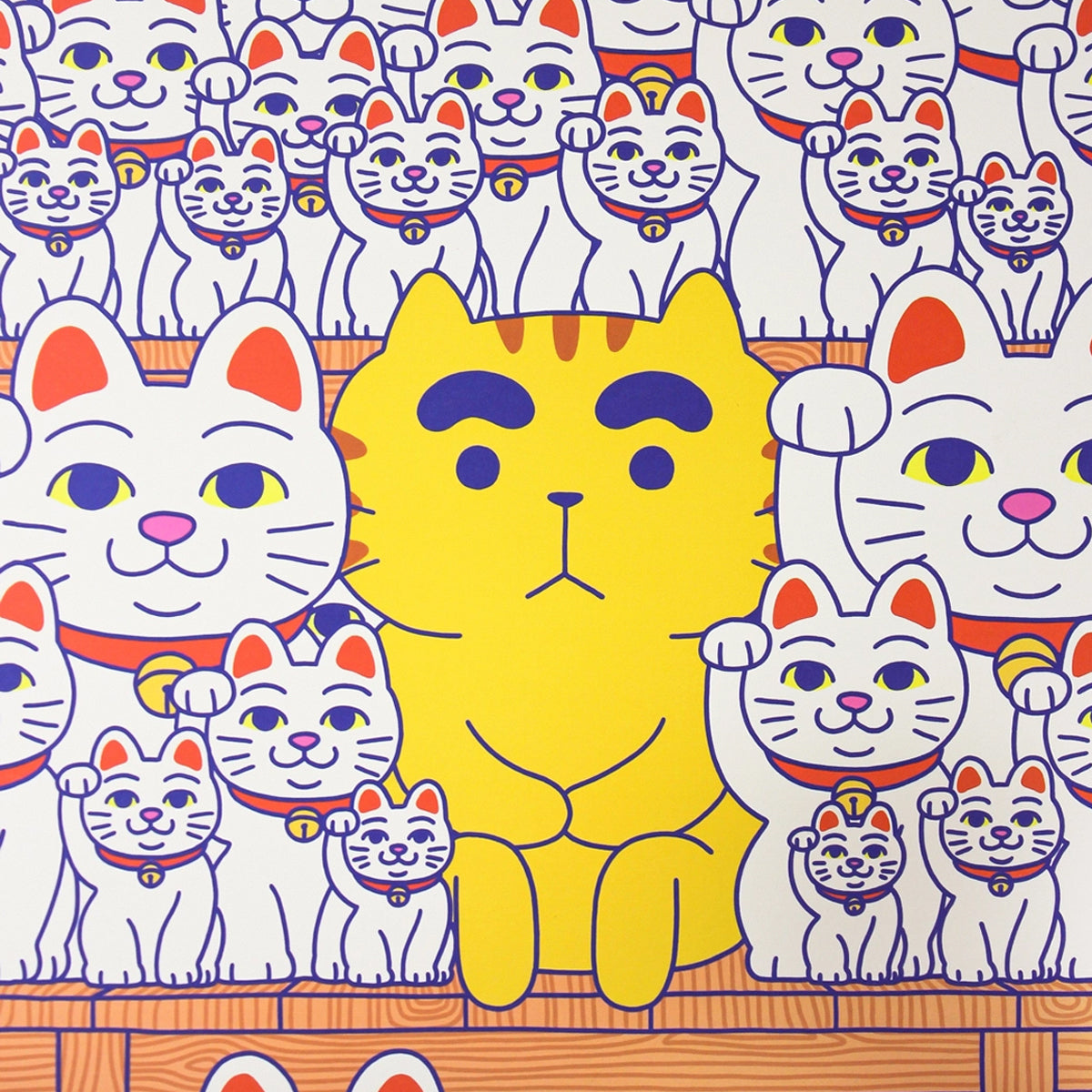Der Maneki-Neko Print von Yeaaah" Studio ist eine verspielte Hommage an den Gotoku-ji-Tempel in Tokio – bekannt für seine unzähligen winkenden Katzenfiguren. Zwischen all den weißen Glückskatzen sitzt eine gelbe Katze, die es offenbar etwas anders meint. Der Druck spielt mit japanischer Symbolik, Humor und klarer Grafik – zwischen Tradition und Augenzwinkern.