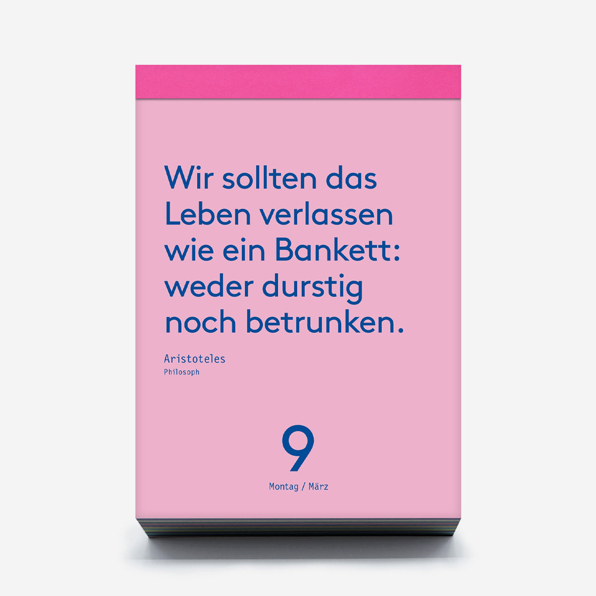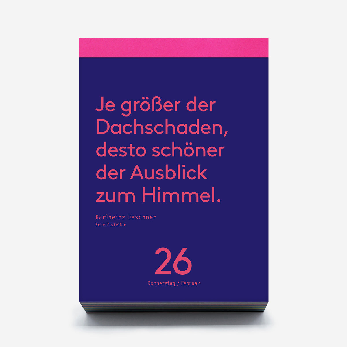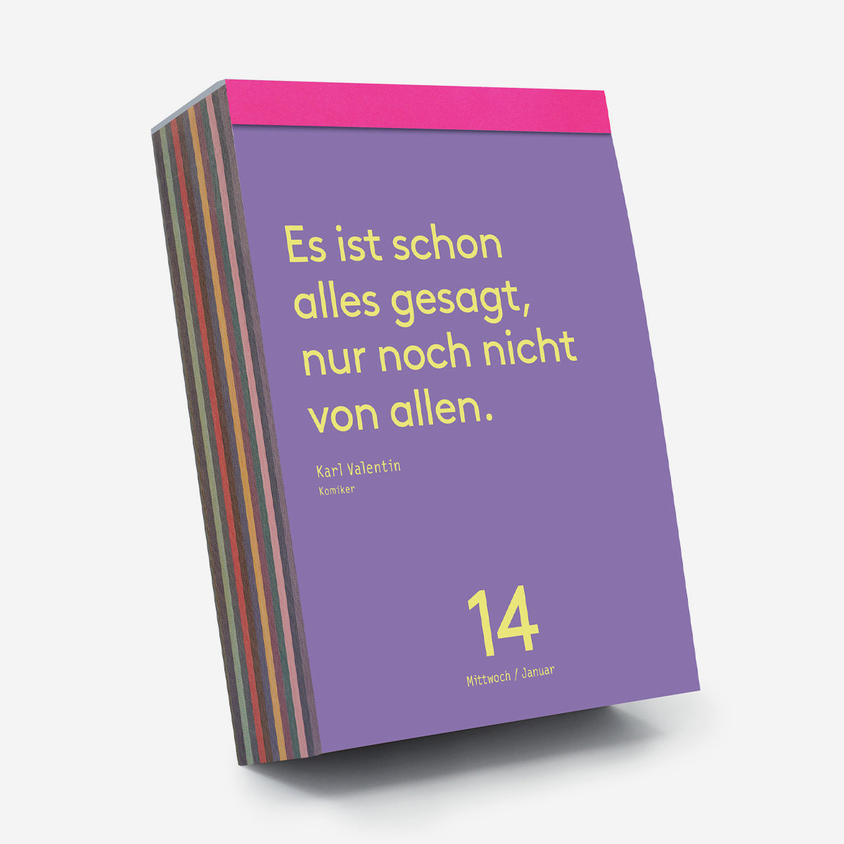 Der liebevoll typografierte Kalender präsentiert uns an jedem Tag im Jahr 2026 ein Zitat zum Nachdenken. Lustig, tiefgründig, klug, manchmal auch melancholisch, kurz oder lang. Philosophen, Musiker, Künstler, aber auch Fundstücke anonymer Verfasser aus dem Internet, alles ist möglich. Von Amy Winehouse und Adorno bis hin zu Andy Warhol und Zappa! Hauptsache, es regt zum Nachdenken, Innehalten und Reflektieren an.