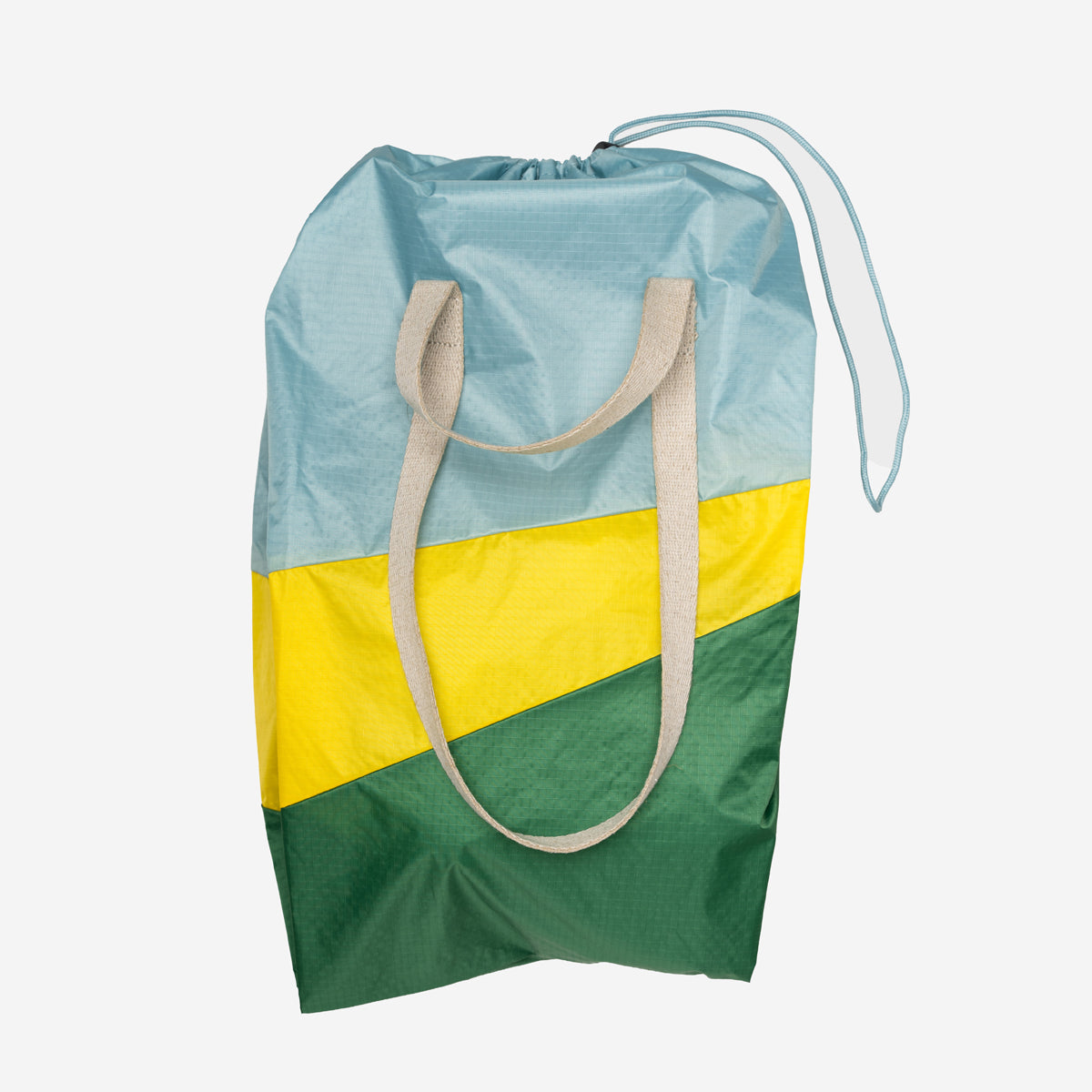 Man kann The New Trash Bag auch wie eine extra-große Version der New Shoppingbag von Susan Bijl verwenden. Abgewandelt vom klassischen Design der großen Einkaufstasche ist der obere Teil hier verlängert und kann mit einem Kordelzug und Stopper verschlossen werden. Dieser obere Teil lässt sich leicht in den Shopper zurückklappen und passt sich der gewünschten Größe an. The New Trash Bag hat zwei Griffe, lang und kurz, um schwere Lasten leicht auf der Schulter zu tragen oder sie bequem in der Hand zu halten.