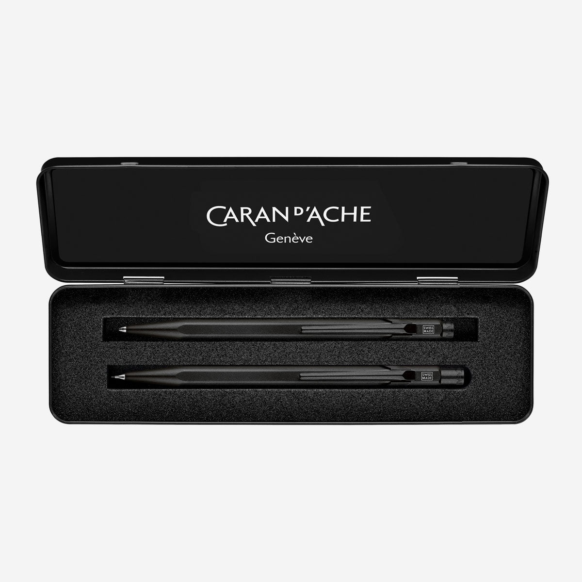 In diesem Set gibt es den ikonischen 849 Kugelschreiber und 844 Minenhalter in monochromen Schwarz, verpackt in einem Metallplumier in glänzendem Schwarz mit Caran d'Ache Logo innen und außen. Der Kugelschreiber wird mit einer Goliath-Mine Fine in Schwarz von Caran d’Ache geliefert und ist mit allen Goliath-Minen von Caran d’Ache kompatibel. Der Minenhalter wird mit einer HB-Graphitmine mit einem Durchmesser von 0.5 mm geliefert. Er hat einen Radiergummi und ein Minenreservoir, zugänglich durch Entfernen des Druckknopfes.