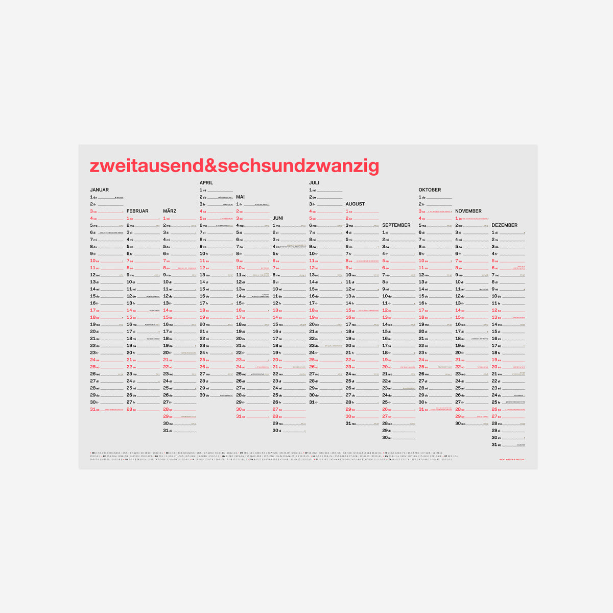 Der Kalender ist als dreifarbiger Siebdruck produziert: Ein Neon-Korall, wie es der Monitor gar nicht wiedergeben kann, für die Wochenenden. Schwarz als Grundfarbe für die Wochentage. Und als Akzentfarbe für die feinen Details pures Gold.