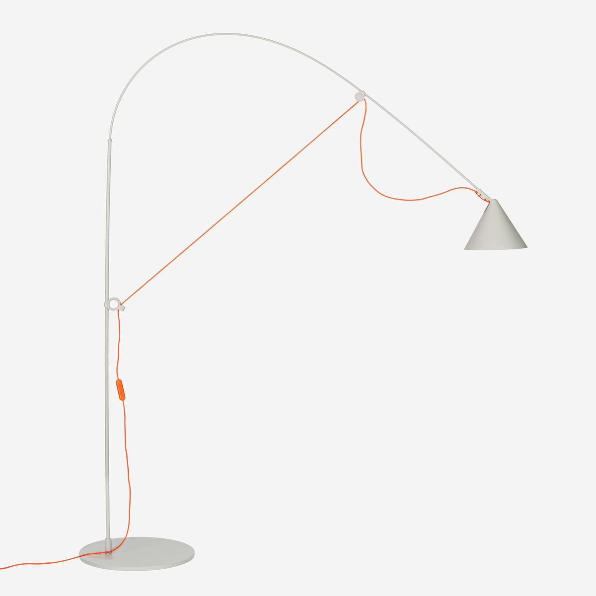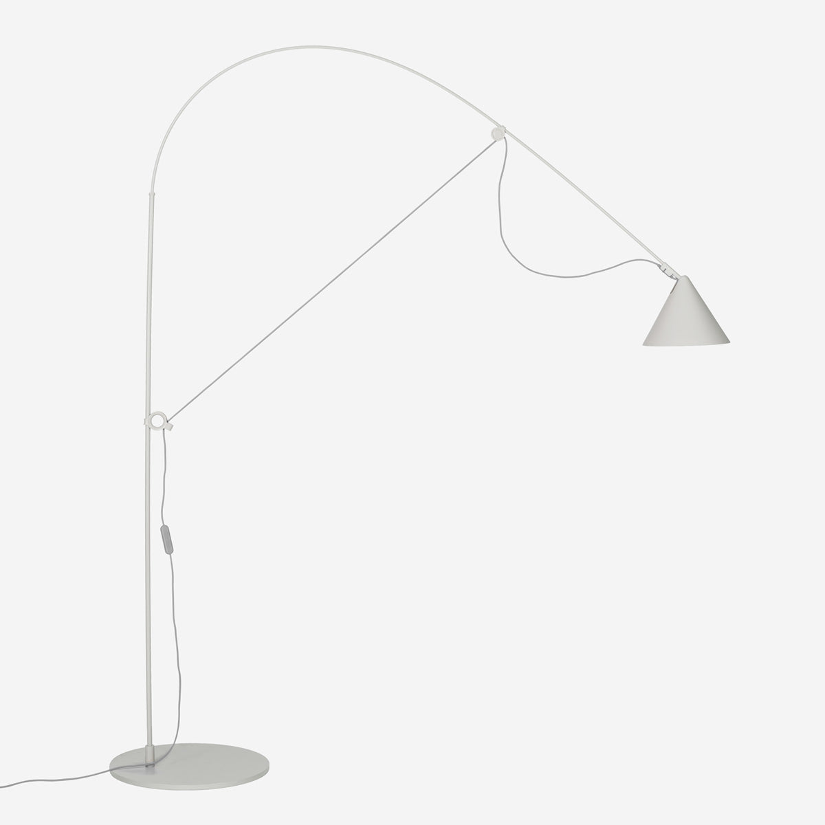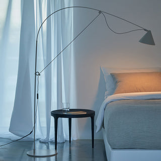 Zentrales Merkmal der AYNO Leuchtenfamilie ist ein Fiberglasstab, welcher mit dem Leuchtenkabel zum Bogen gespannt wird. Die Eigenspannung des Stabes sorgt für eine Leuchte ganz ohne Gelenke. Durch das Verschieben der beiden Verstellringe an Halterung und Kopf der Leuchte wird der Fiberglasstab in die gewünschte Position gebogen, und somit das Licht in die gewünschte Richtung gelenkt. Der Radius des Bogens lässt sich durch Verschieben der Verstellringe beliebig ändern. Die Feinjustierung des Lichts erfolgt durch den schwenkbarem Leuchtenschirm.