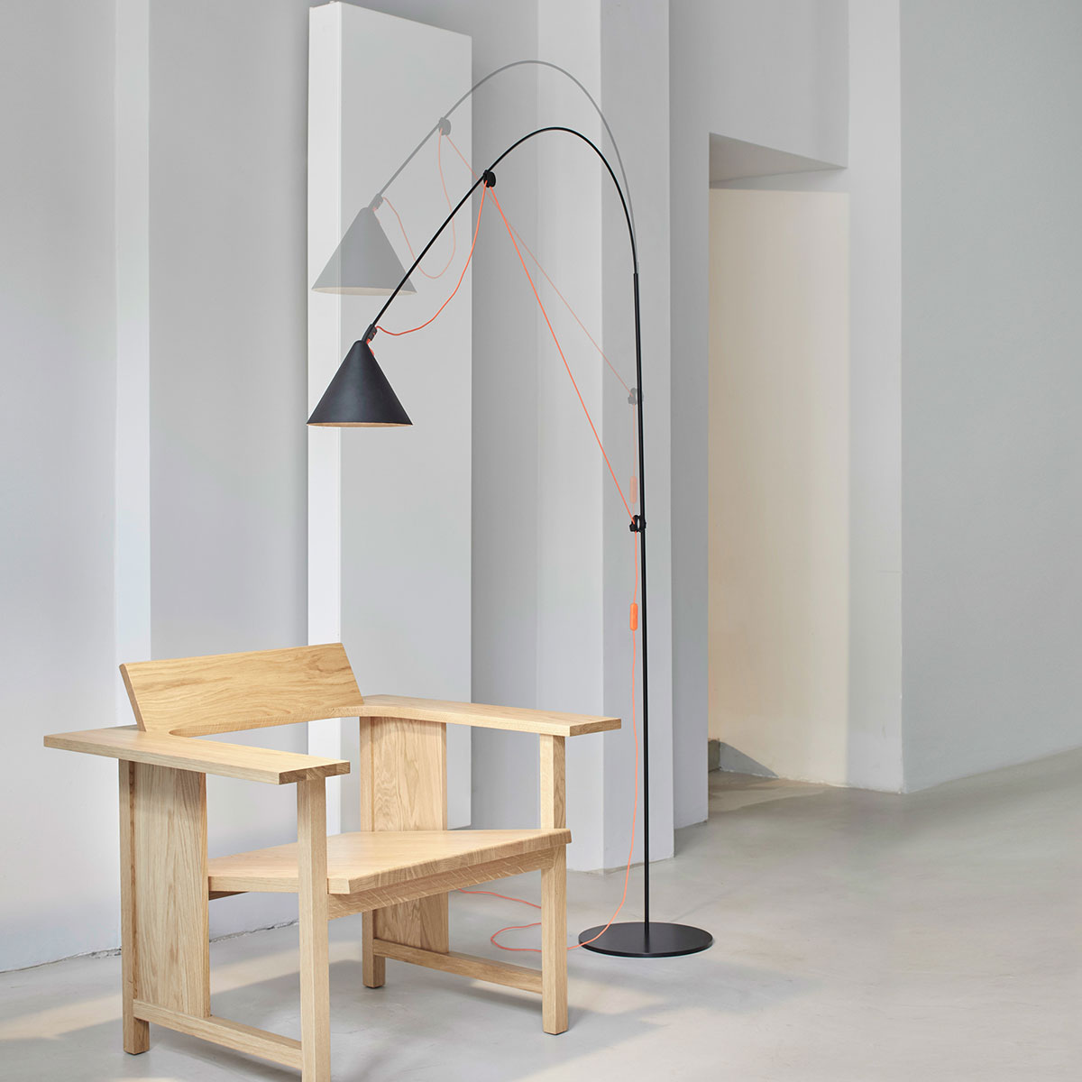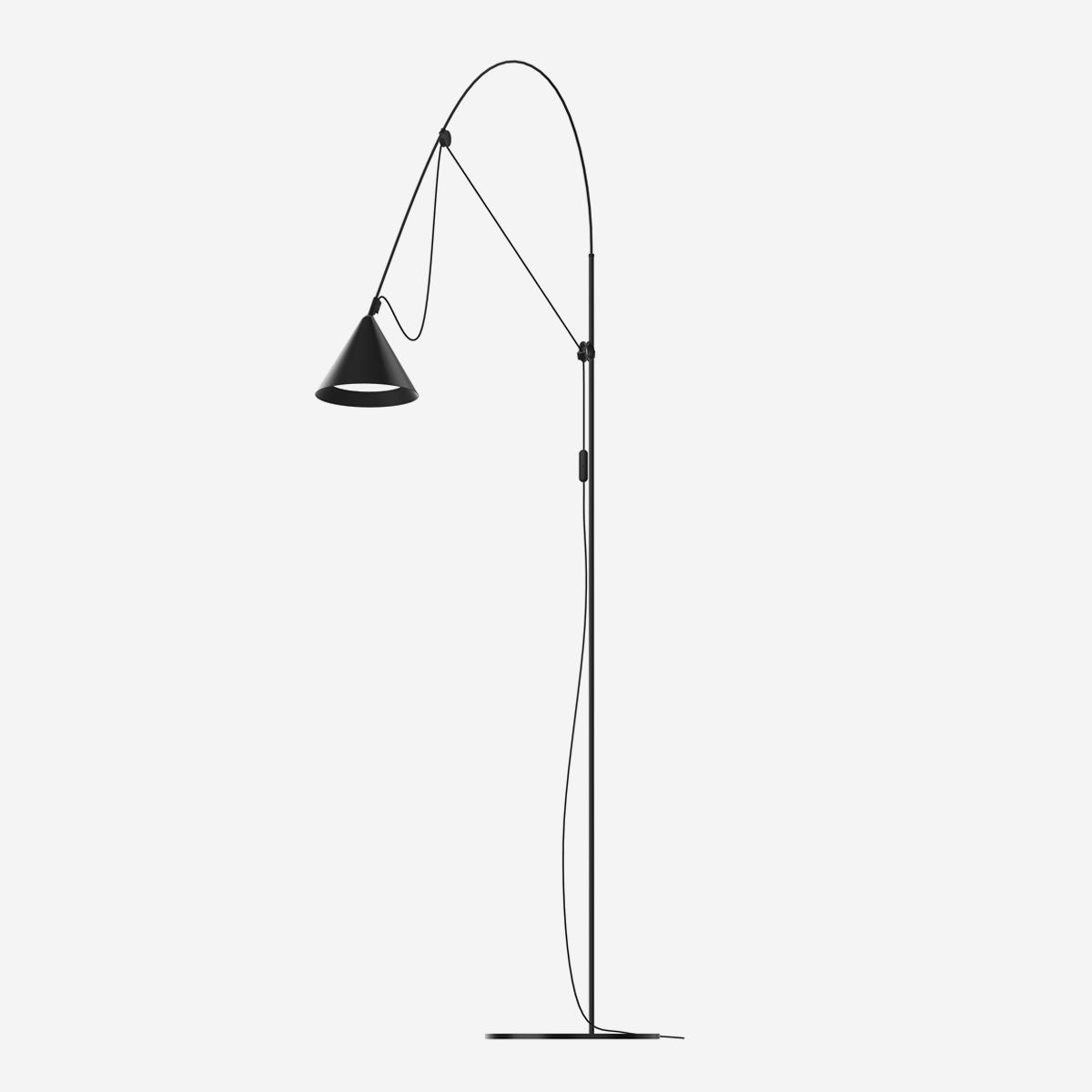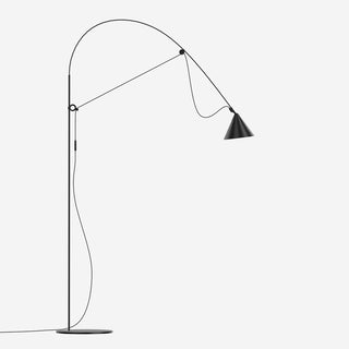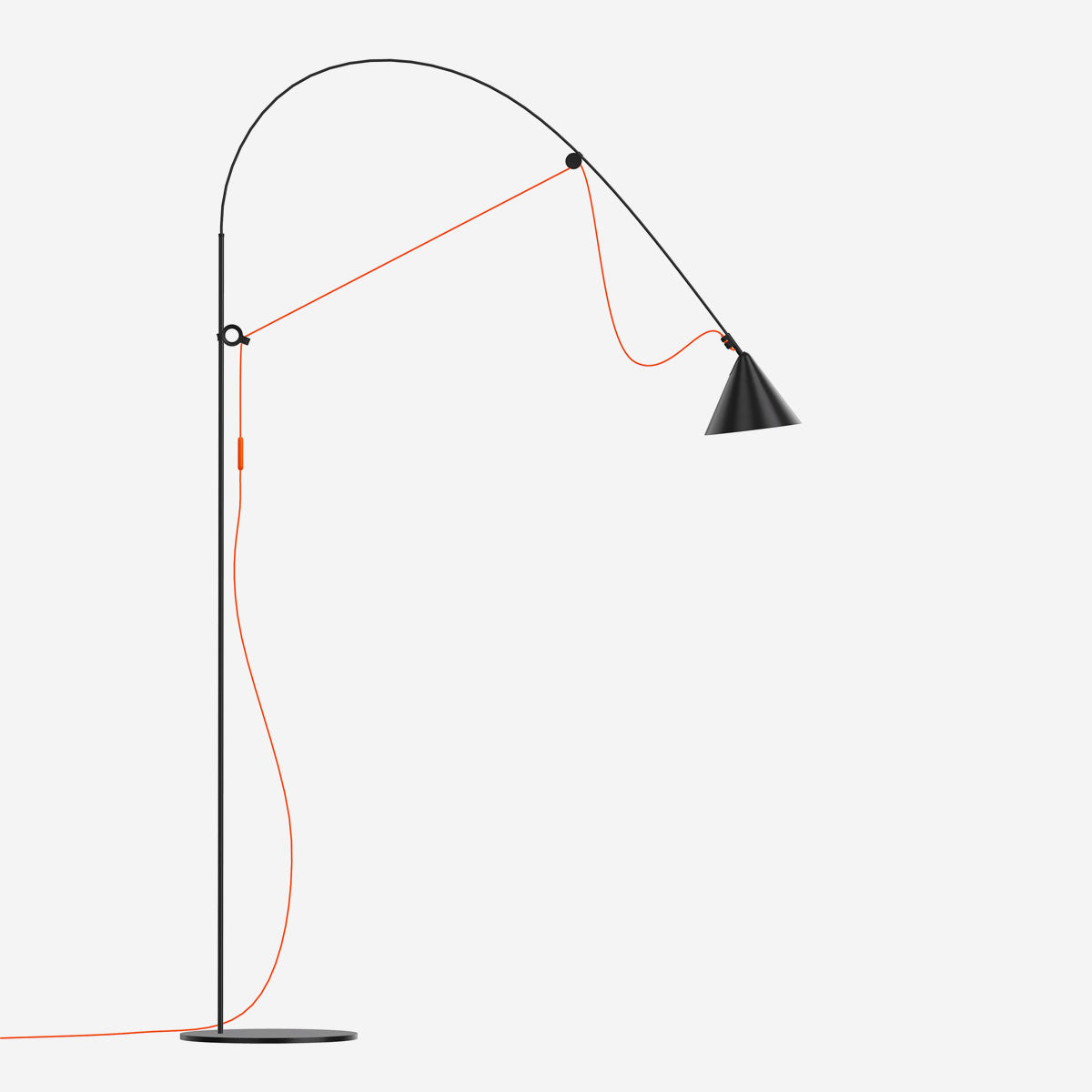 The central feature of the AYNO family of lights is a fiberglass rod, which is stretched into an arch with the lamp cable. The inherent tension of the rod ensures a lamp without any joints. By moving the two adjustment rings on the holder and head of the lamp, the fiberglass rod is bent into the desired position, thus directing the light in the desired direction. The radius of the arch can be changed as desired by moving the adjustment rings. The light can be finely adjusted using the pivoting lampshade.