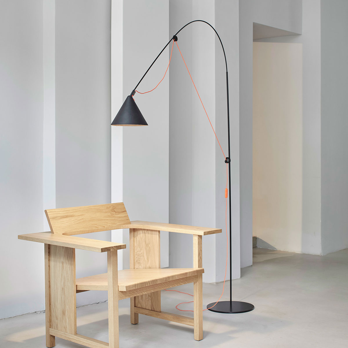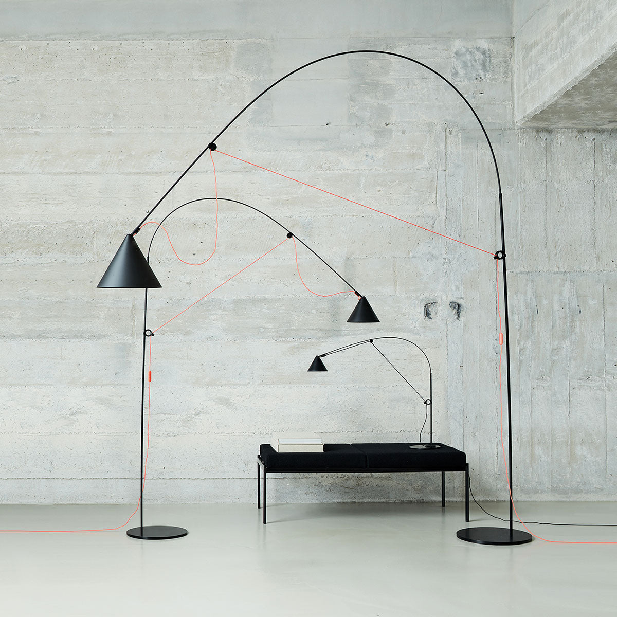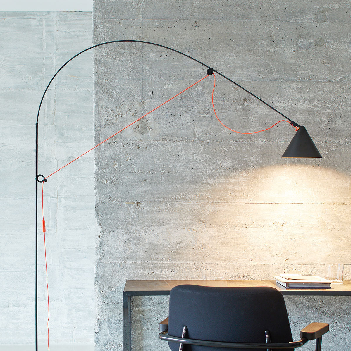The central feature of the AYNO family of lights is a fiberglass rod, which is stretched into an arch with the lamp cable. The inherent tension of the rod ensures a lamp without any joints. By moving the two adjustment rings on the holder and head of the lamp, the fiberglass rod is bent into the desired position, thus directing the light in the desired direction. The radius of the arch can be changed as desired by moving the adjustment rings. The light can be finely adjusted using the pivoting lampshade.