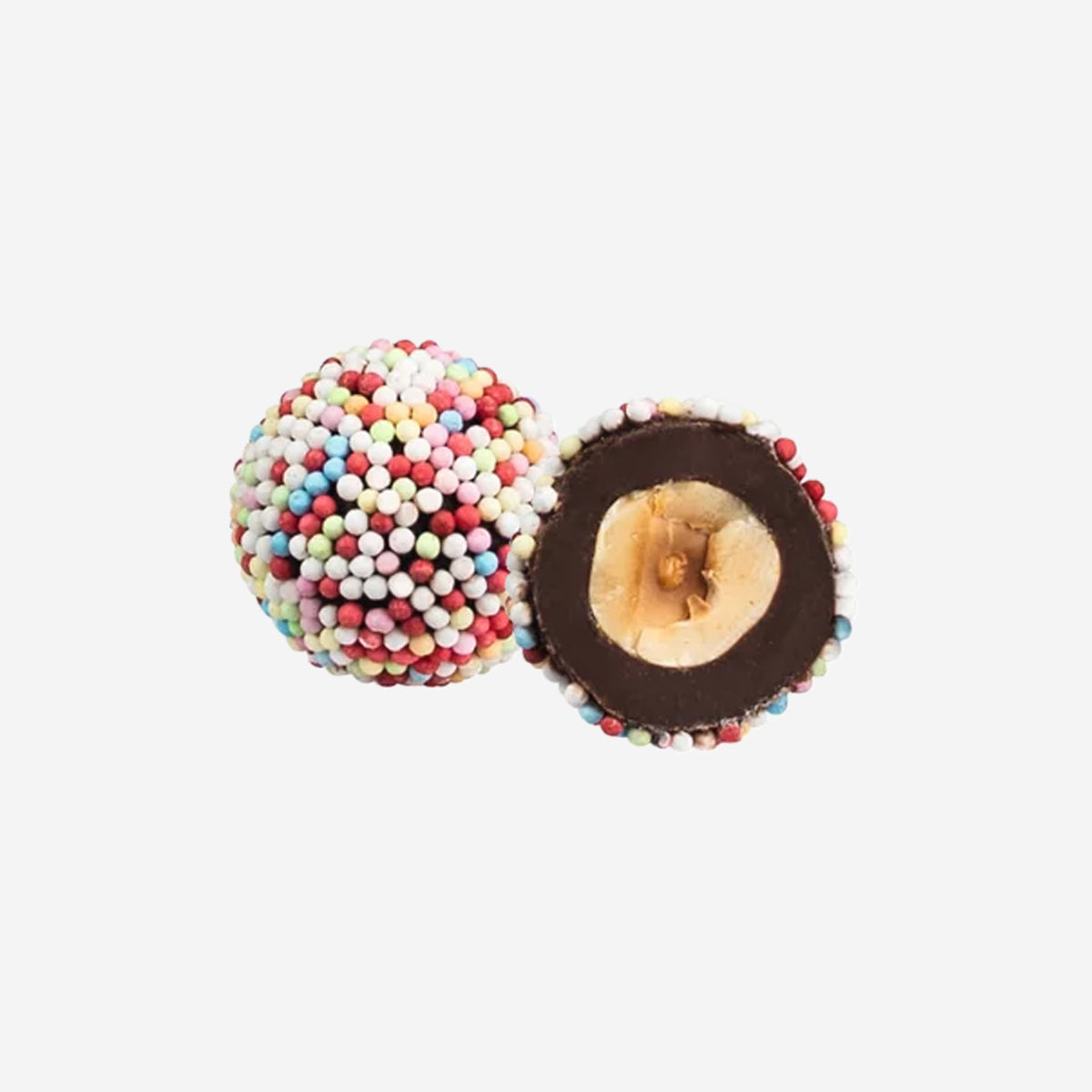 Eine Spezialität aus dem Hause Antica Torroneria. Die knackigen Schokoladen-Pralinés bestehen aus 60%iger dunkler Schokolade und einer ganzen gerösteten IGP-Haselnuss aus dem Piemont im Innern. Überzogen mit bunten Zuckerstreuseln.