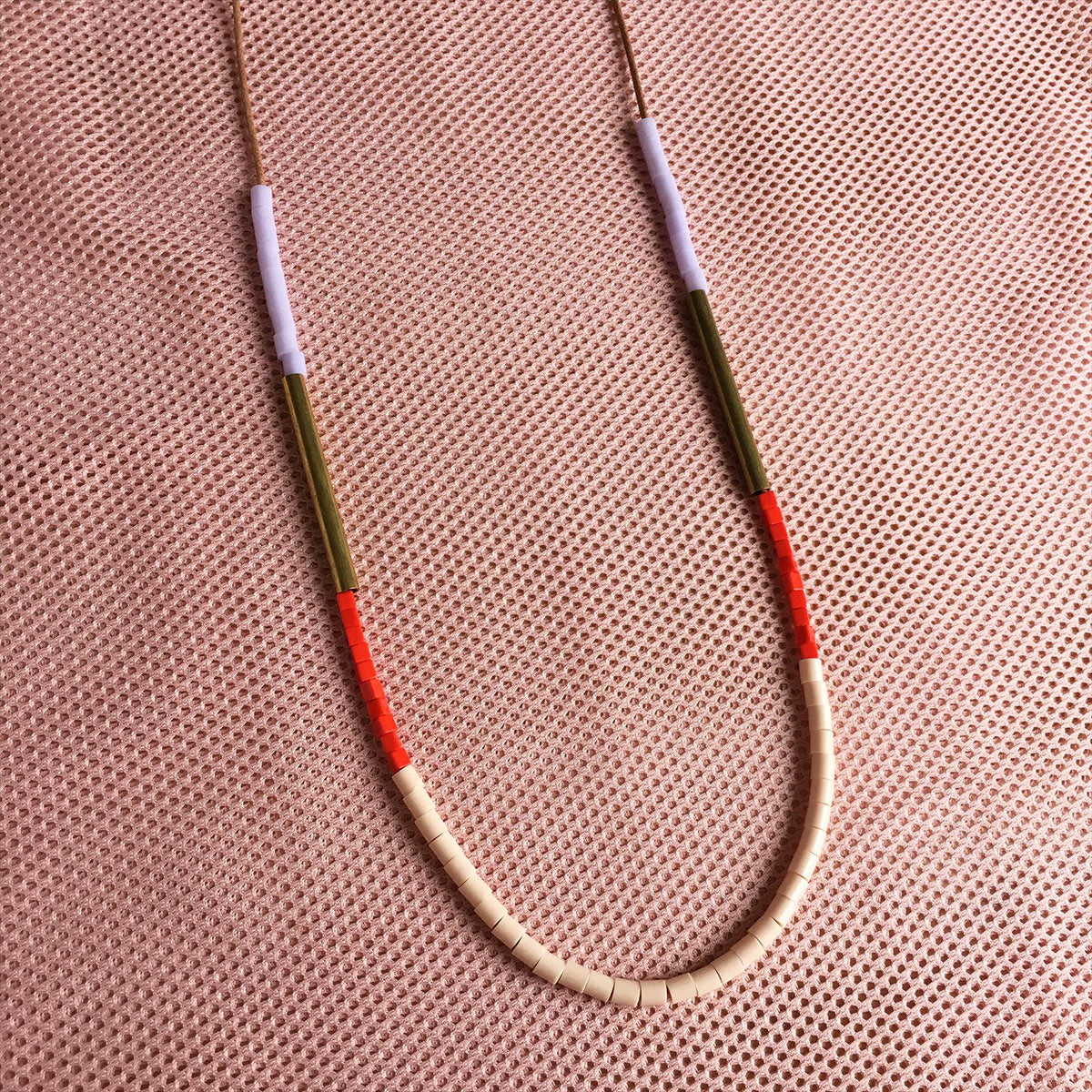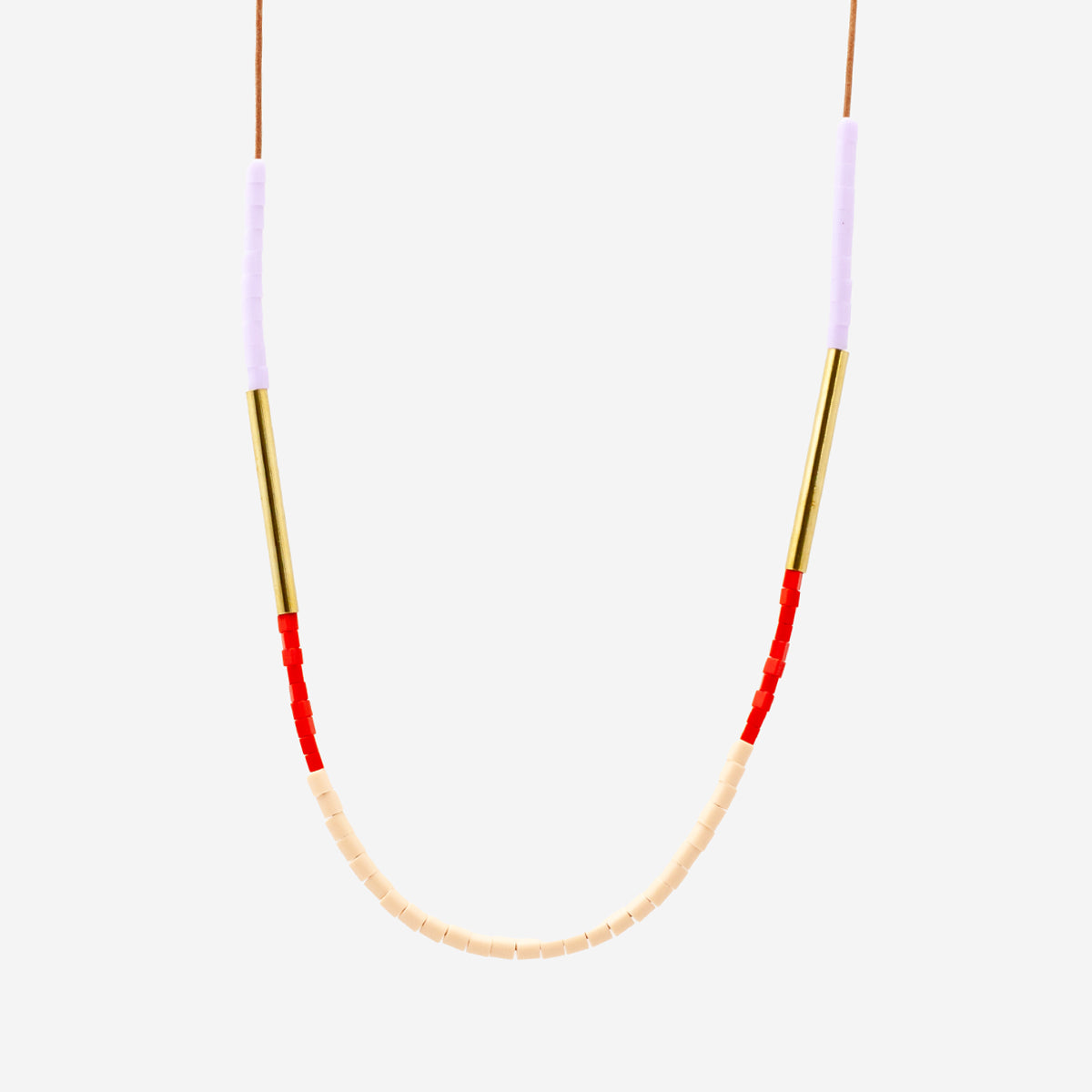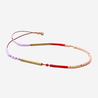 Das Layer Necklace ist eine handgefertigte Halskette mit Messingröhrchen, lilafarbenen und lachsfarbenen Kunststoffperlen und leuchtend roten Glasperlen an einem Naturlederband. In der hübschen Gift Box ist es schönes Geschenk für einen lässigen Sommerlook!