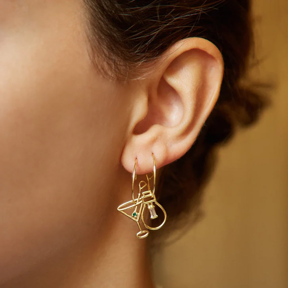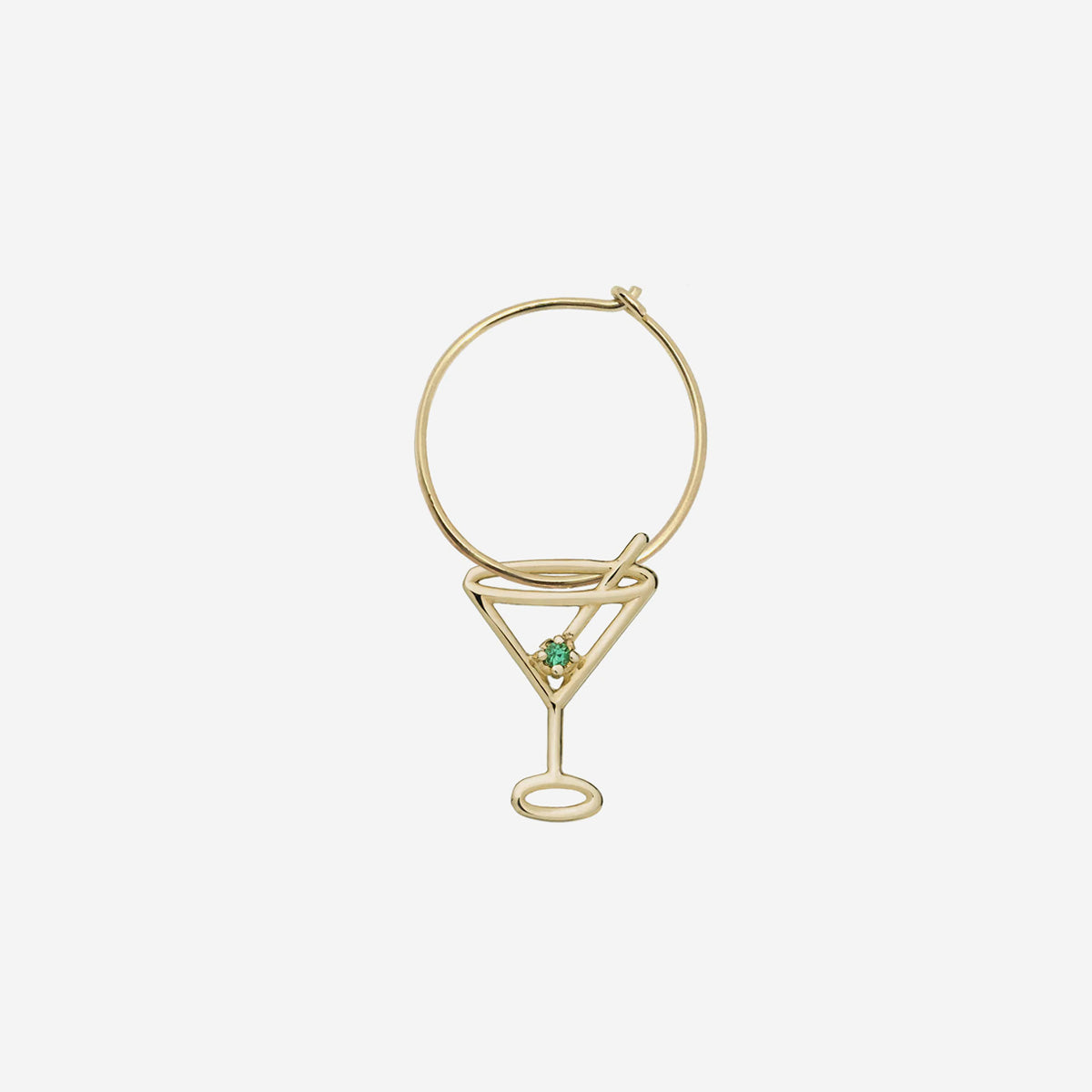 The Martini emerald earring by Aliita with the small olive made of real emerald makes us want a drink and puts us in a good mood. The emerald sparkles with every movement of the head. Cheers!