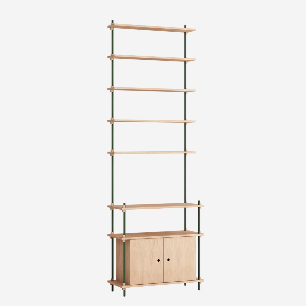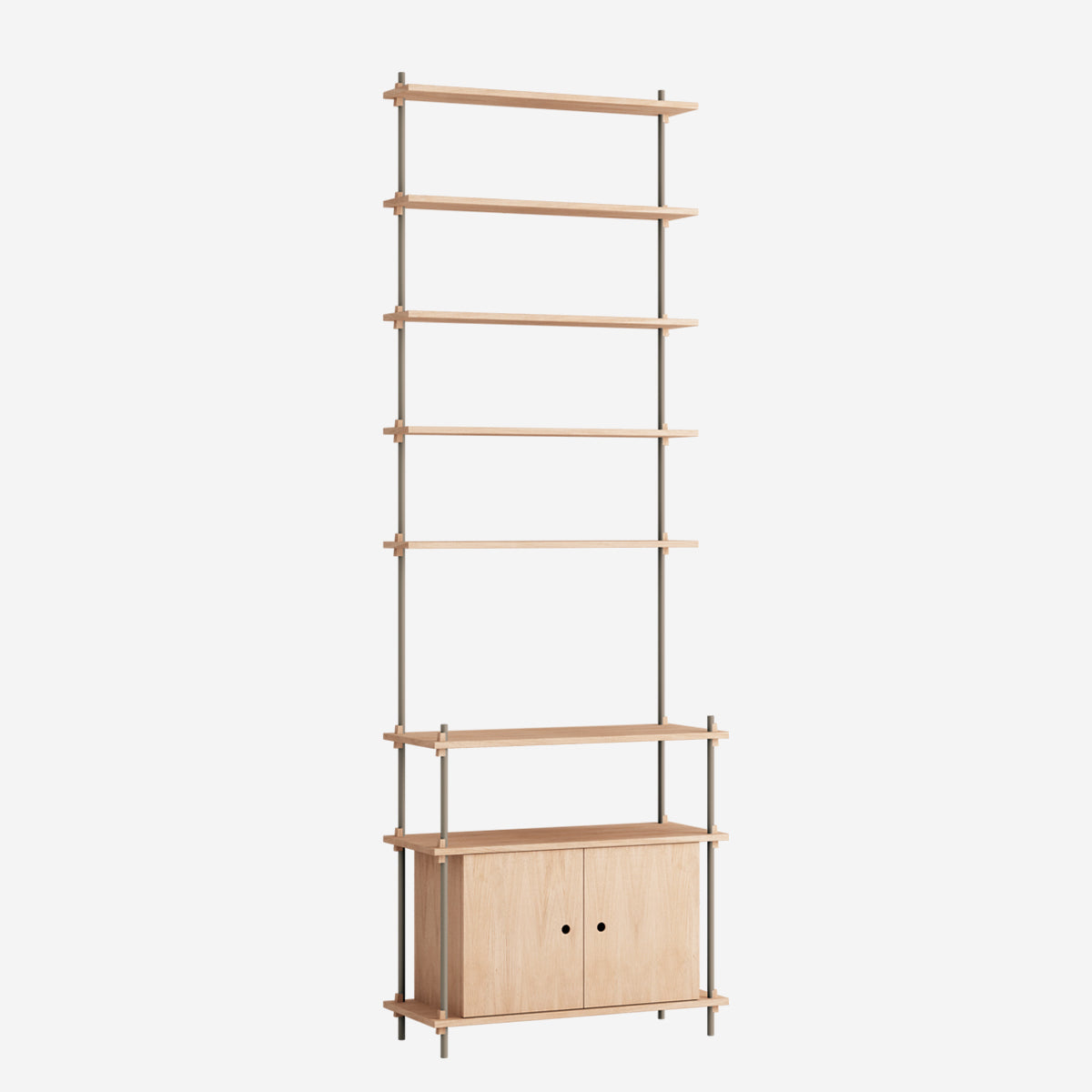 Die Böden und Schrankmodule sind in Eiche Natur und geräuchert, in Schwarz und in Weiß verfügbar. Die Stangen gibt es neben klassischem Schwarz und Weiß auch in Deep Blue, Pine Green, Warm Grey. Durch die Kombination verschiedener Längen, die fast unsichtbar ineinander geschraubt werden, ist fast jede individuelle Höhe konfigurierbar.