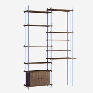 Die Böden und Schrankmodule sind in Eiche Natur und geräuchert, in Schwarz und in Weiß verfügbar. Die Stangen gibt es neben klassischem Schwarz und Weiß auch in Deep Blue, Pine Green, Warm Grey. Durch die Kombination verschiedener Längen, die fast unsichtbar ineinander geschraubt werden, ist fast jede individuelle Höhe konfigurierbar.